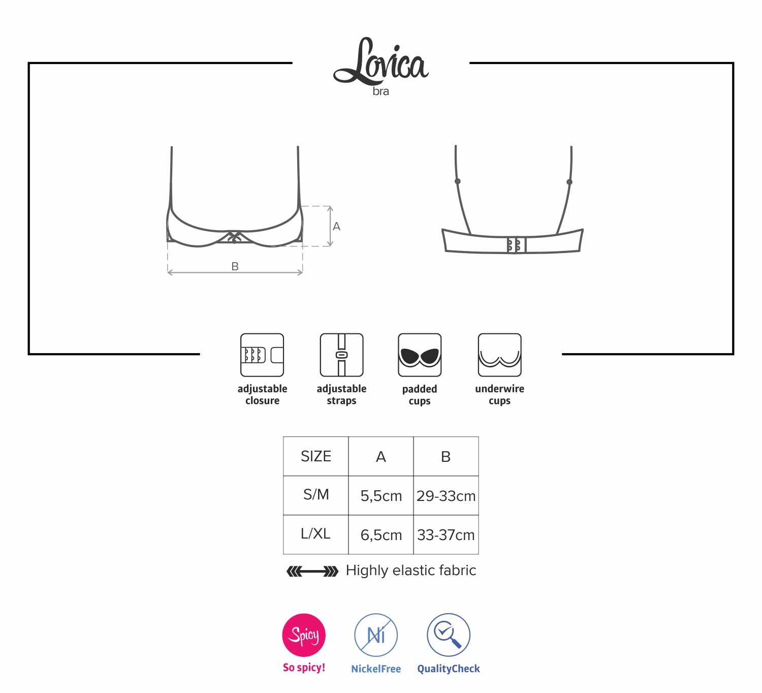 Halb-BH Lovica in rot mit verstellbaren Trägern und mehrstufigem Rückenverschluss. Mit gepolsterten Bügel-Cups, die mit Spitze, einer Schleife und einem glänzenden Schmuckelement verziert sind. Glänzendes und weiches Material.
