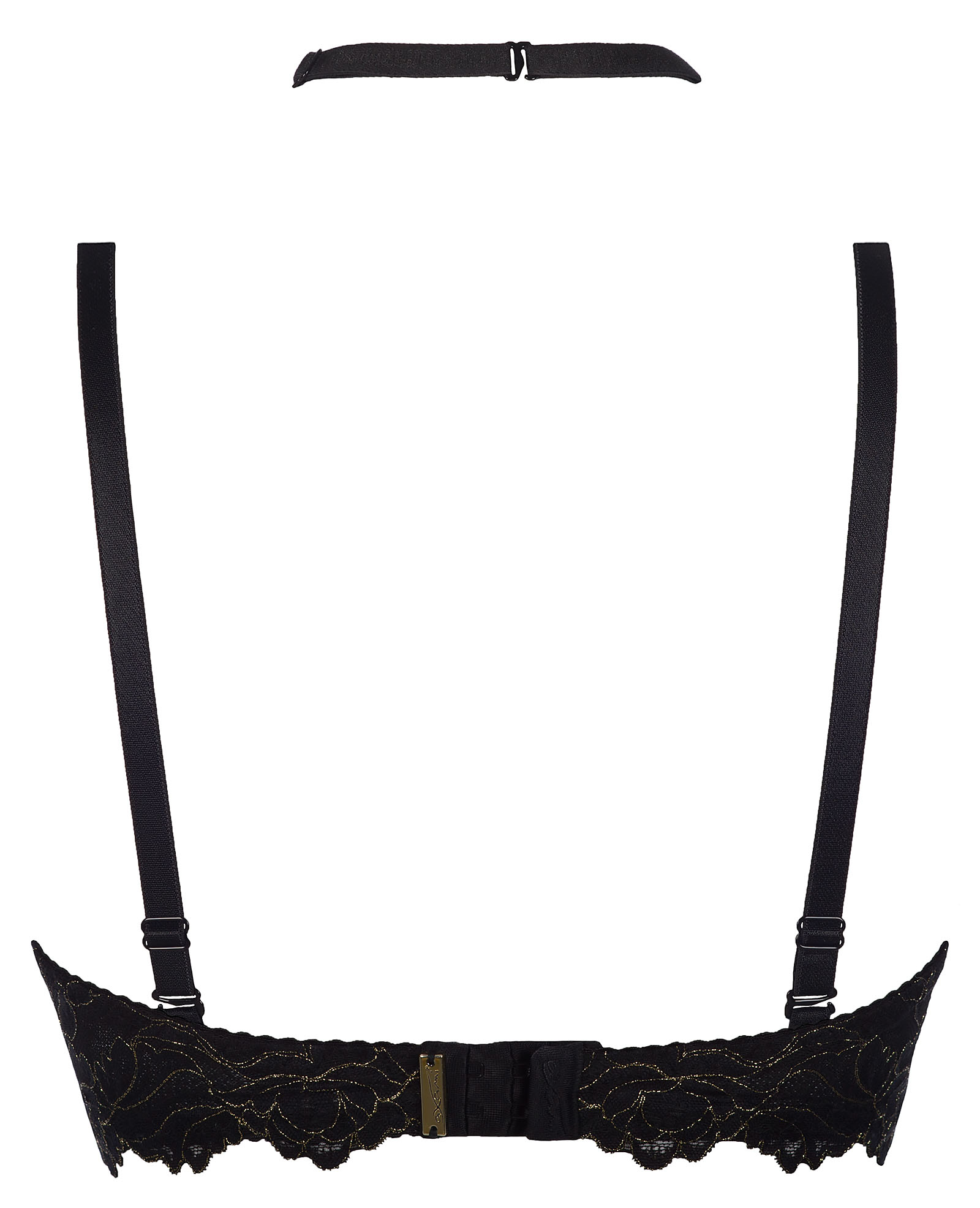 Schwarzer BH mit gepolsterten Cups. Der BH hat am Nacken einen Ösenverschluss und zwei zusätzliche Träger, die abnehmbar sind. Hinten mit einem mehrstufigen Hakenverschluss. Das Blumenmuster wird mit goldenen Fäden dargestellt.