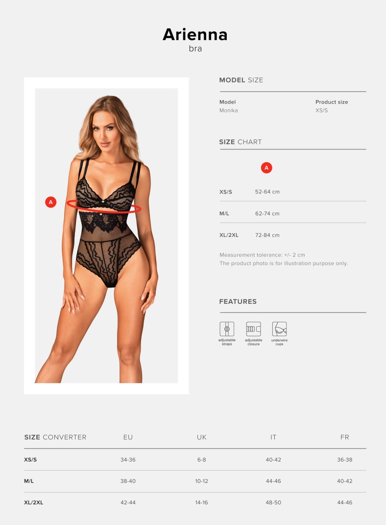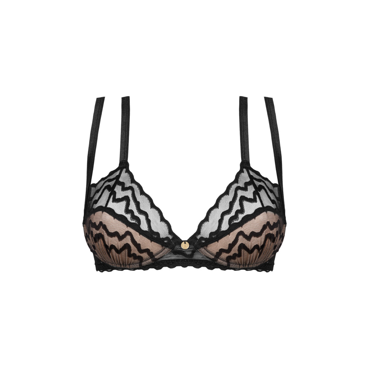 Schwarzer BH aus transparentem, gemustertem Material. Mit verstellbaren Doppel-Trägern und einem verstellbaren Hakenverschluss. Verfügbare Größen: XS/S, M/L, XL/XXL