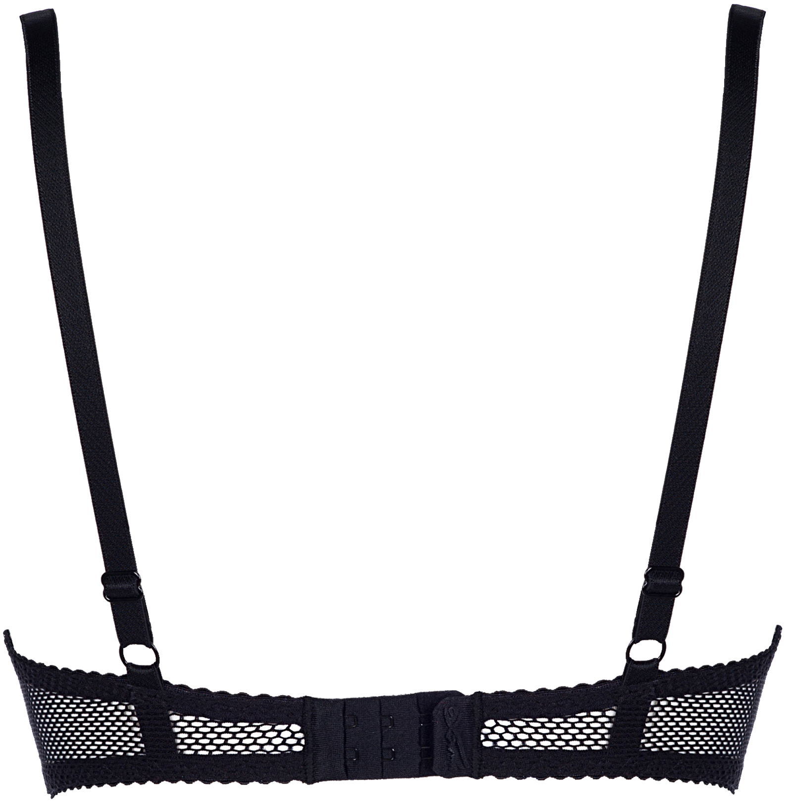 Schwarzer BH aus durchsichtigem Netz mit Blumenstickerei. Unter den Körbchen ist ein Satinband... mehr