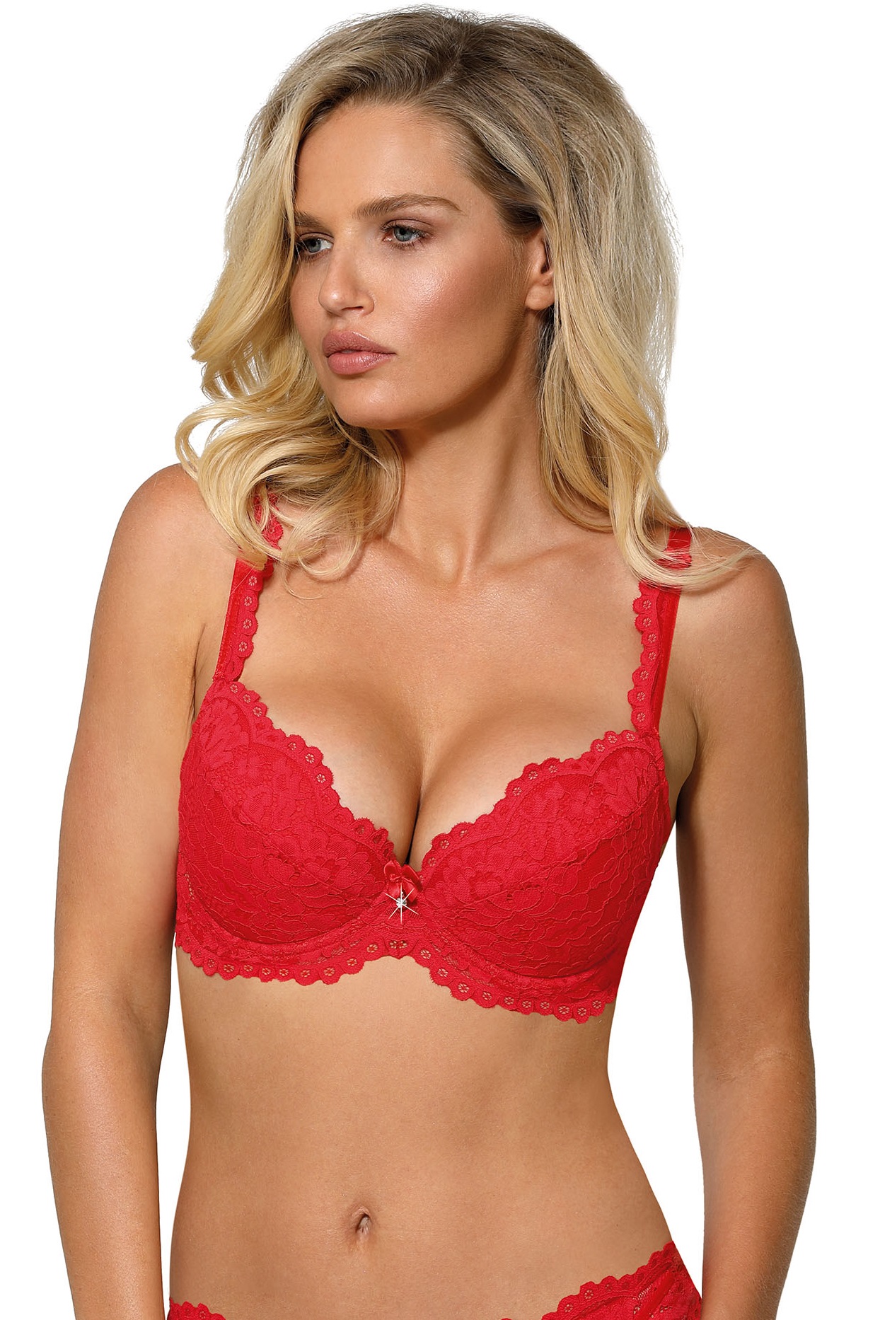 Roter Push-Up-BH im Hochzeitsstil mit Spitze und einem Schmuckelement vorne. Mit Bügeln und verstellbaren Trägern.