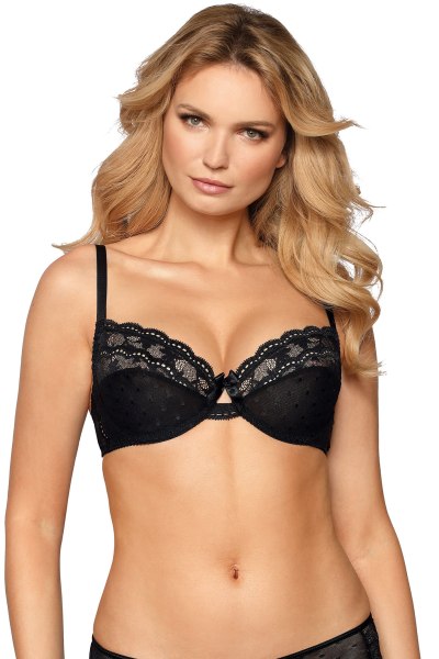 Spitzenverzierter BH in schwarz mit eingearbeiteten Bügeln. Rückenverschluss und Träger sind verstellbar. Vorne mit einem Pünktchenmuster. Verfügbare Cupgrößen: B, C, D Unterbrustumfang: 70, 75, 80, 85