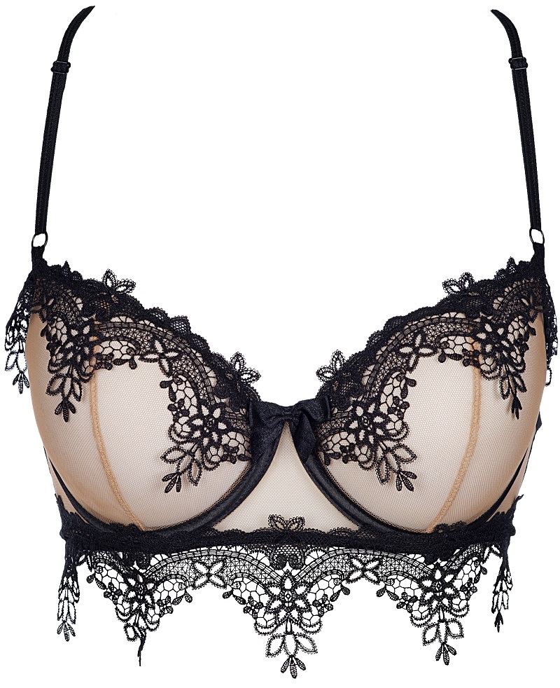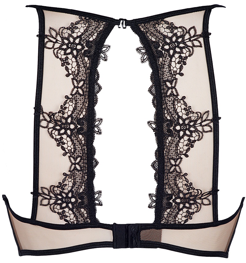 Beigefarbener Bügel-BH mit schwarzer Spitzenverzierung. Hinten mit einen mehrfach verstellbaren Hakenverschluss. Aus einem leicht transparentem Material genäht.