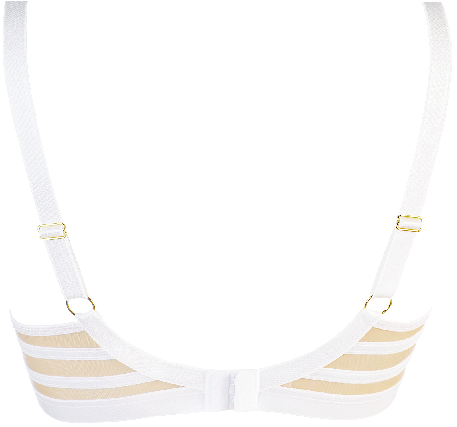 Transparenter BH aus Tüll in weiß und beige mit Blumenmotiv vorne. Träger und Rückenverschluss sind individuell einstellbar.