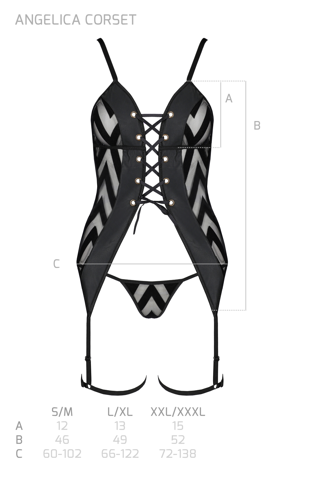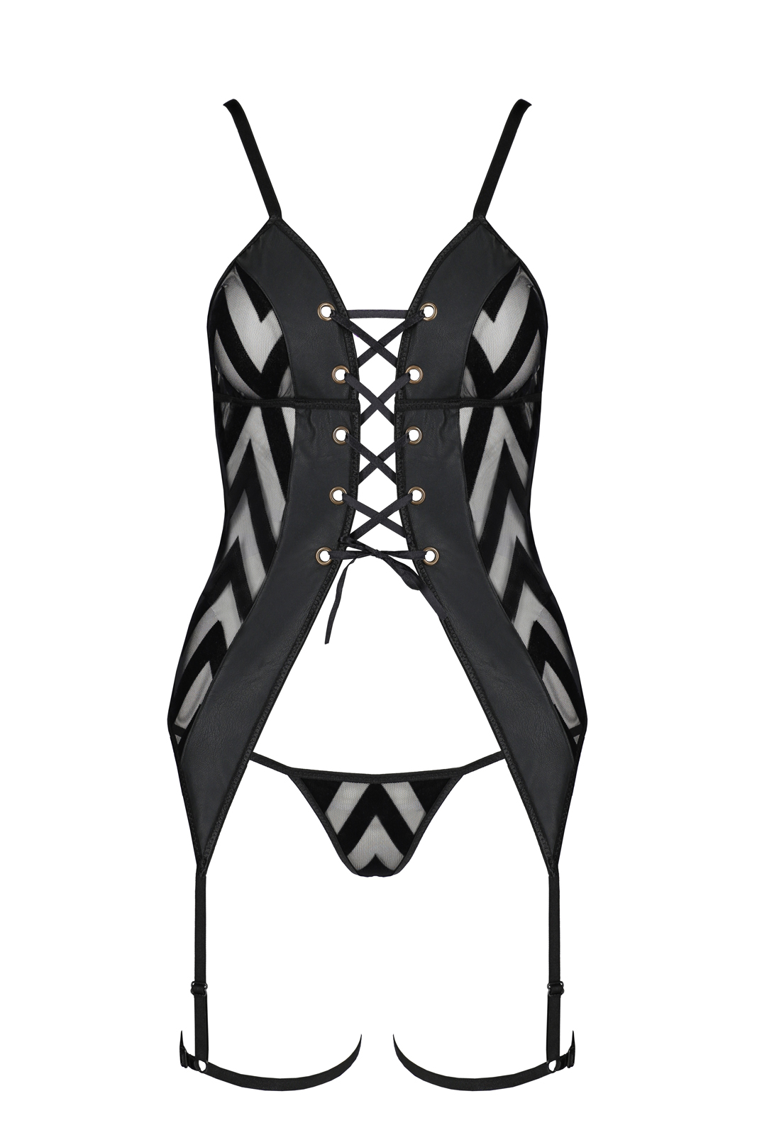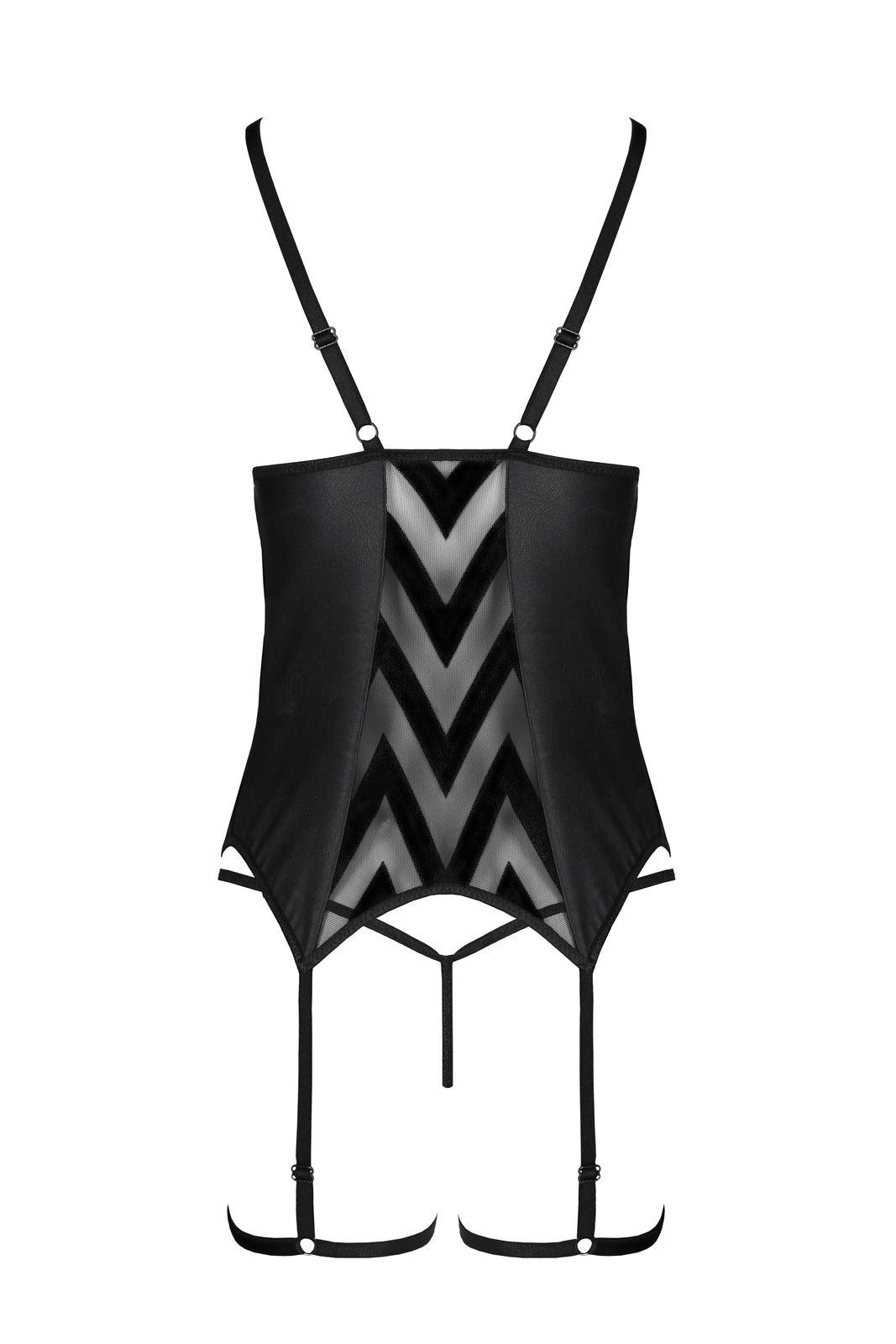 Schwarze Strapscorsage aus Kunstleder und Tüll. Mit Schnürung und verstellbaren Trägern. Verziert mit Zick-Zack-Muster. Mit festgenähten Strumpfhaltern und String. Verfügbare Größen: S/M, L/XL, XXL/3XL