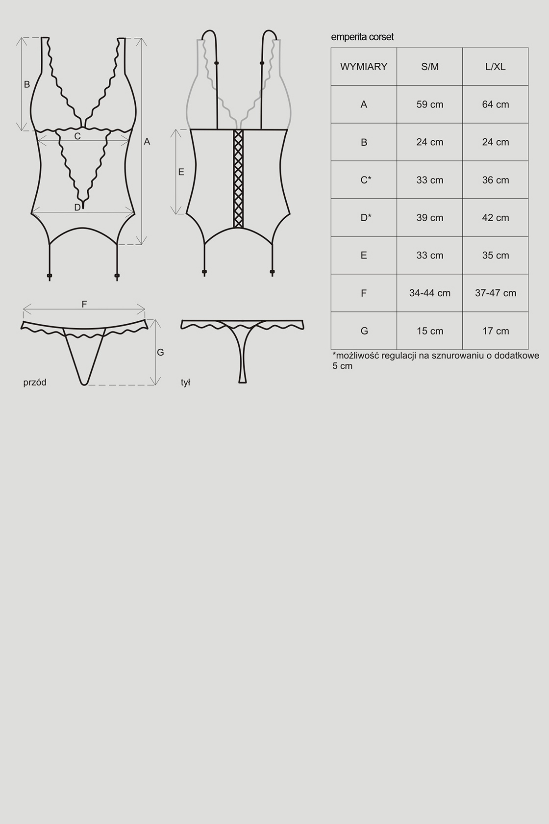 Corsage "Emperita" von Obsessive. Feminine Corsage mit Strapshaltern und floralen Ornamenten an Hals, Bauch und Hüfte. Verlockender, tiefer Ausschnitt mit geschmackvoller Spitzenverzierung. Verstellbare Träger und Rückenschnürung für eine perfekte Passform. Glatte Rückseite aus transparentem Material. Passender Spitzenstring inklusive. Verfügbare Größen: S/M, L/XL, XXL