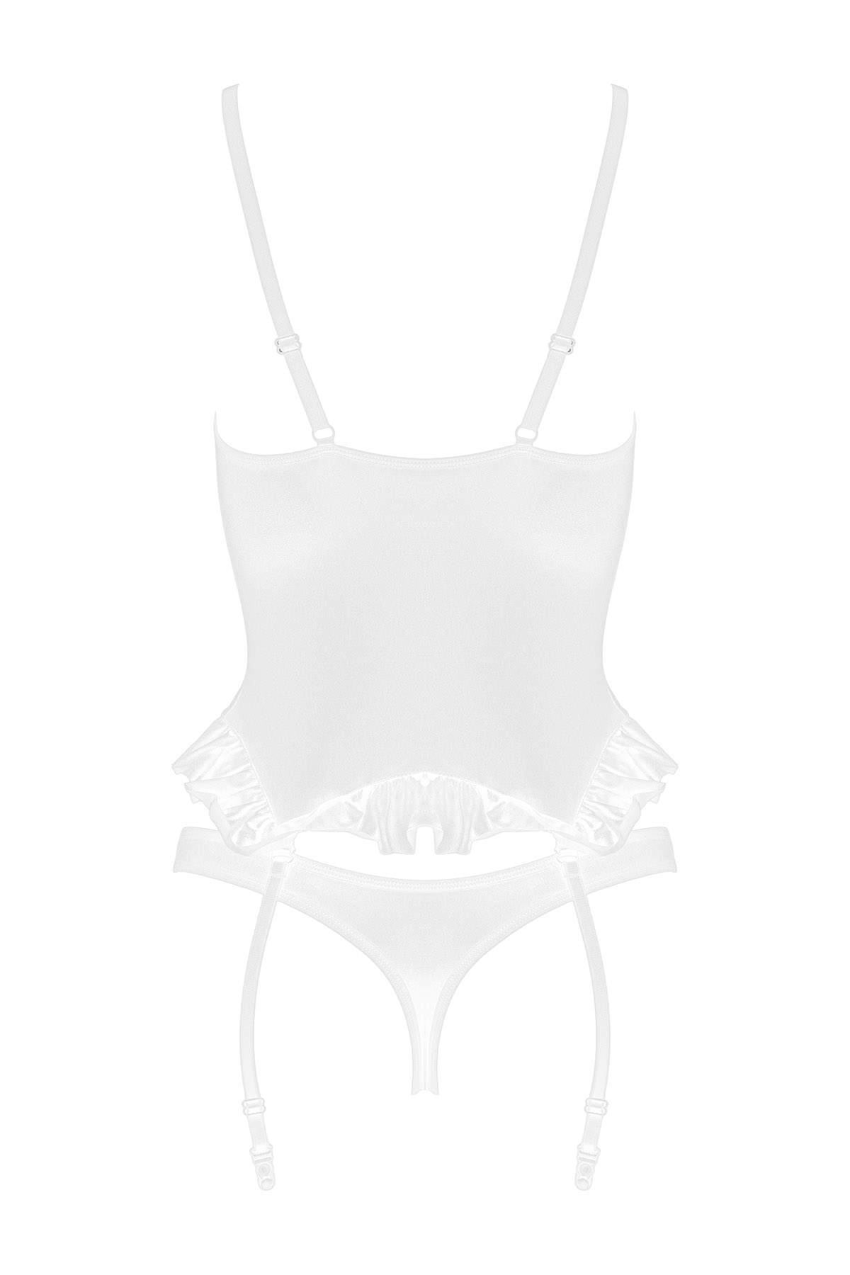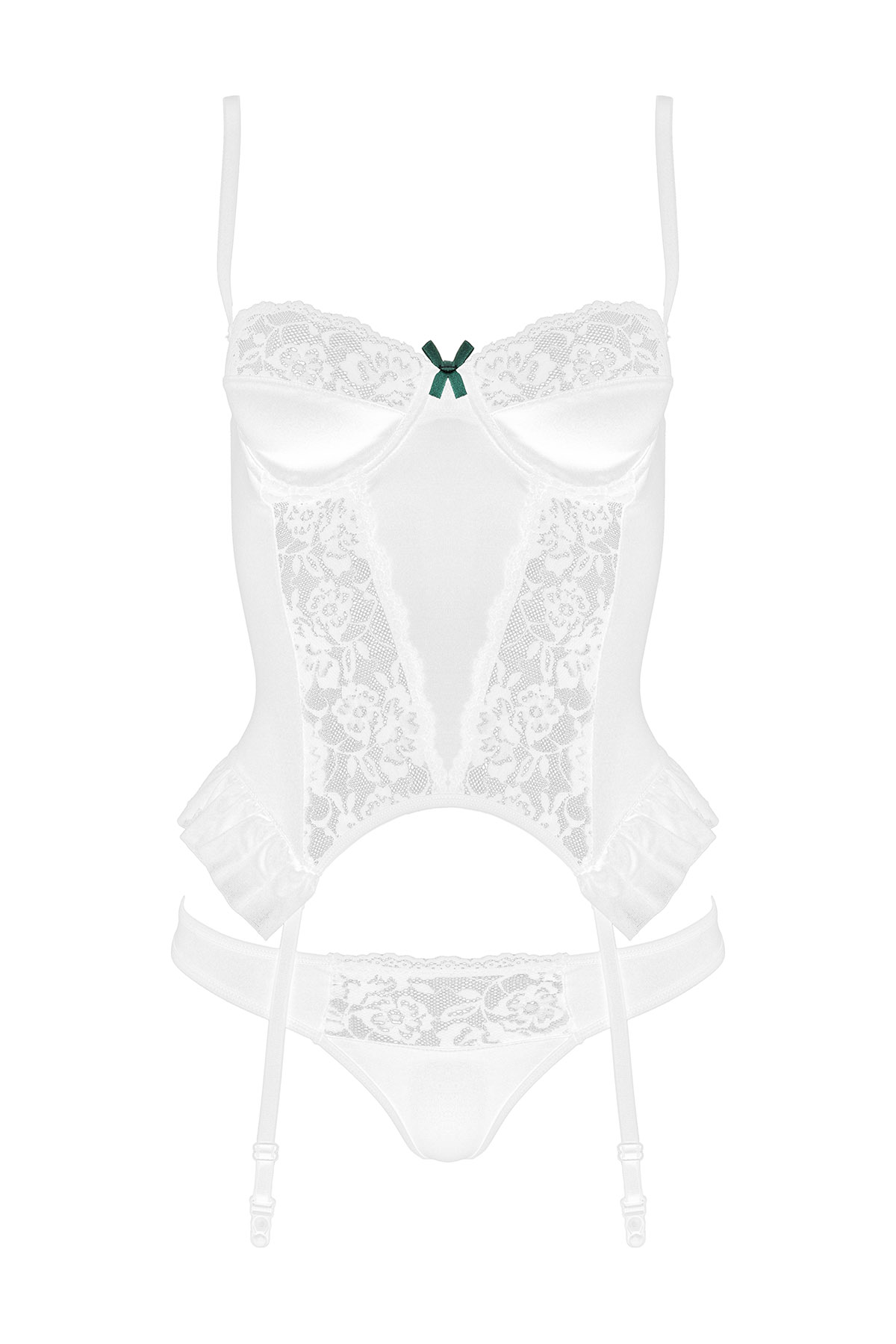 Corsage Lagoon in weiß aus elastischem Satin verziert mit zarter Blütenspitze. Mit verstellbaren Trägern und unterlegten Bügel-Cups. Verstellbare und abnehmbare Strapshalter. Im gleichen Design ein passender String. Verfügbare Größen: S/M, L/XL, XXL