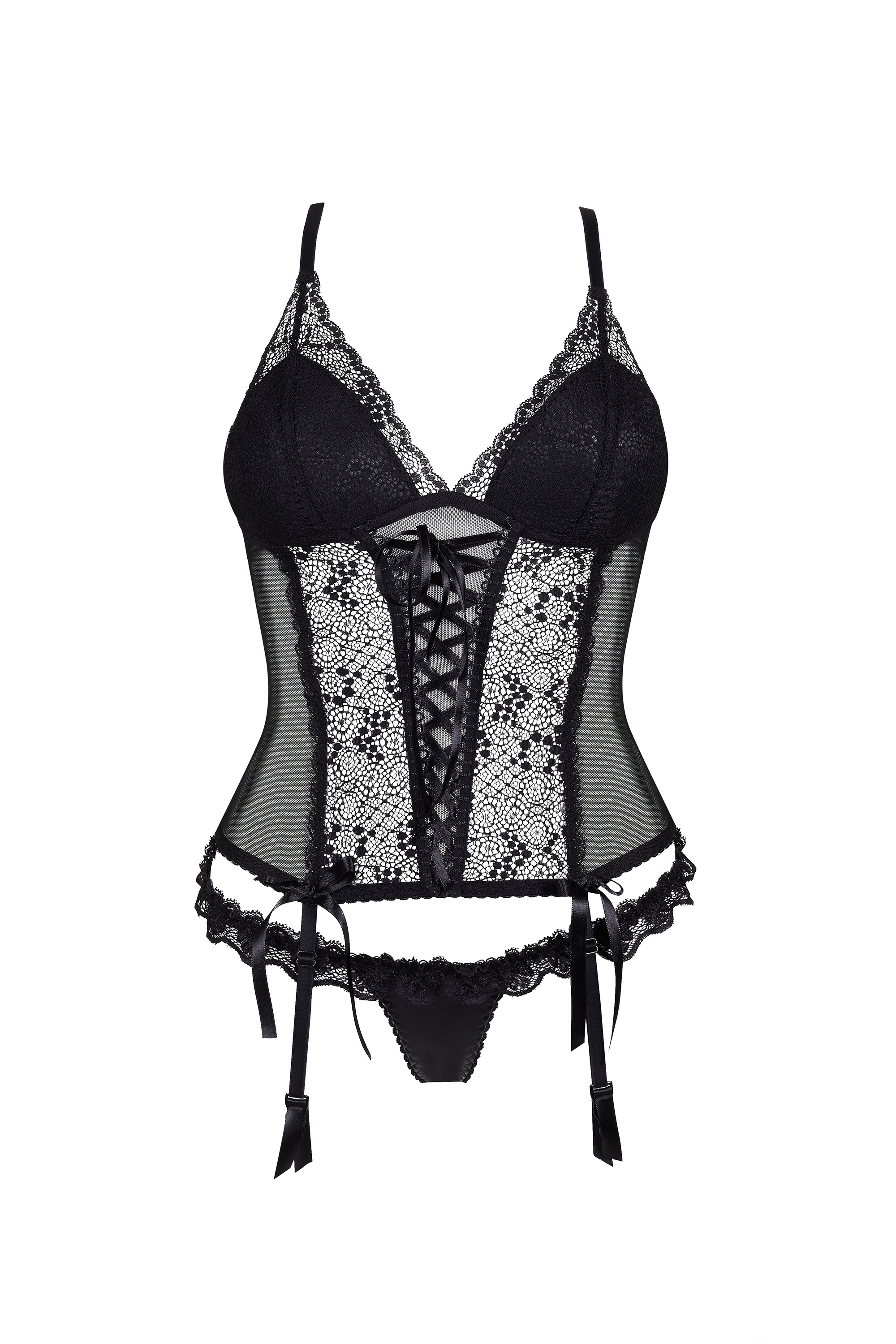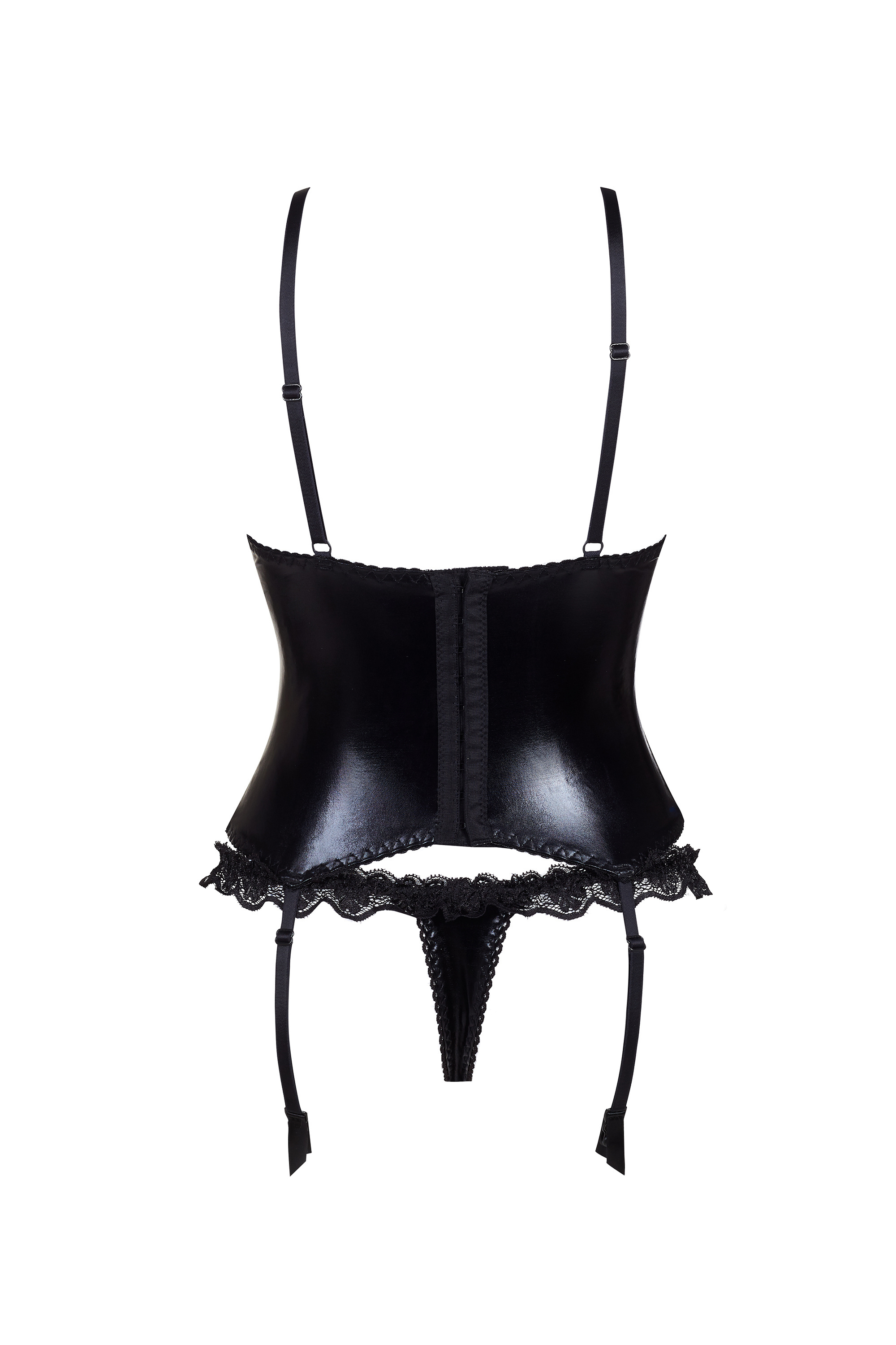 Corsage in schwarz mit verstellbaren Strapsen. Hinten aus glänzendem Wetlook-Material. Mit verstellbaren Trägern und einem verstellbaren Rückenverschluss. Im Set ein passender String, ohne Strümpfe.
