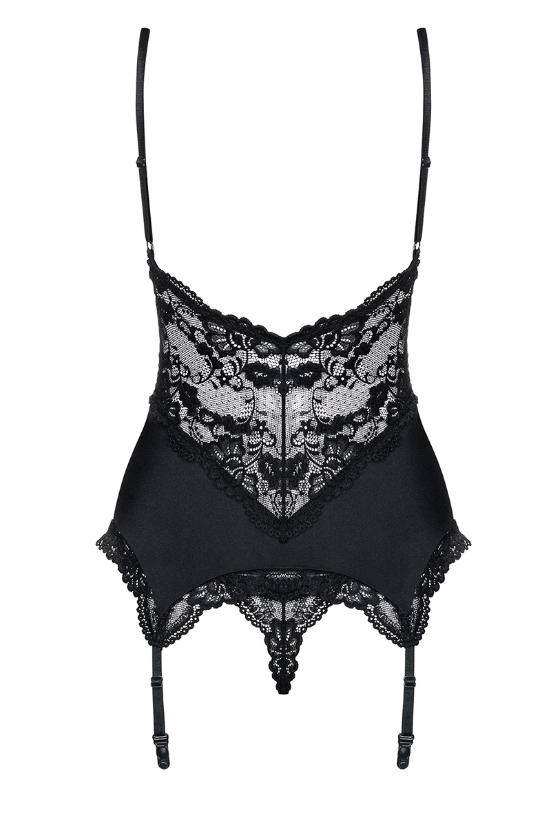 Schwarze Corsage mit floraler Spitze, verstellbaren Trägern und Strumpfhaltern. Weiche, gepolsterte Cups setzen Ihre Brust perfekt in Szene. Ein passender, schwarzer Spitzenstring ist inklusive. Schönes und elastisches Material.