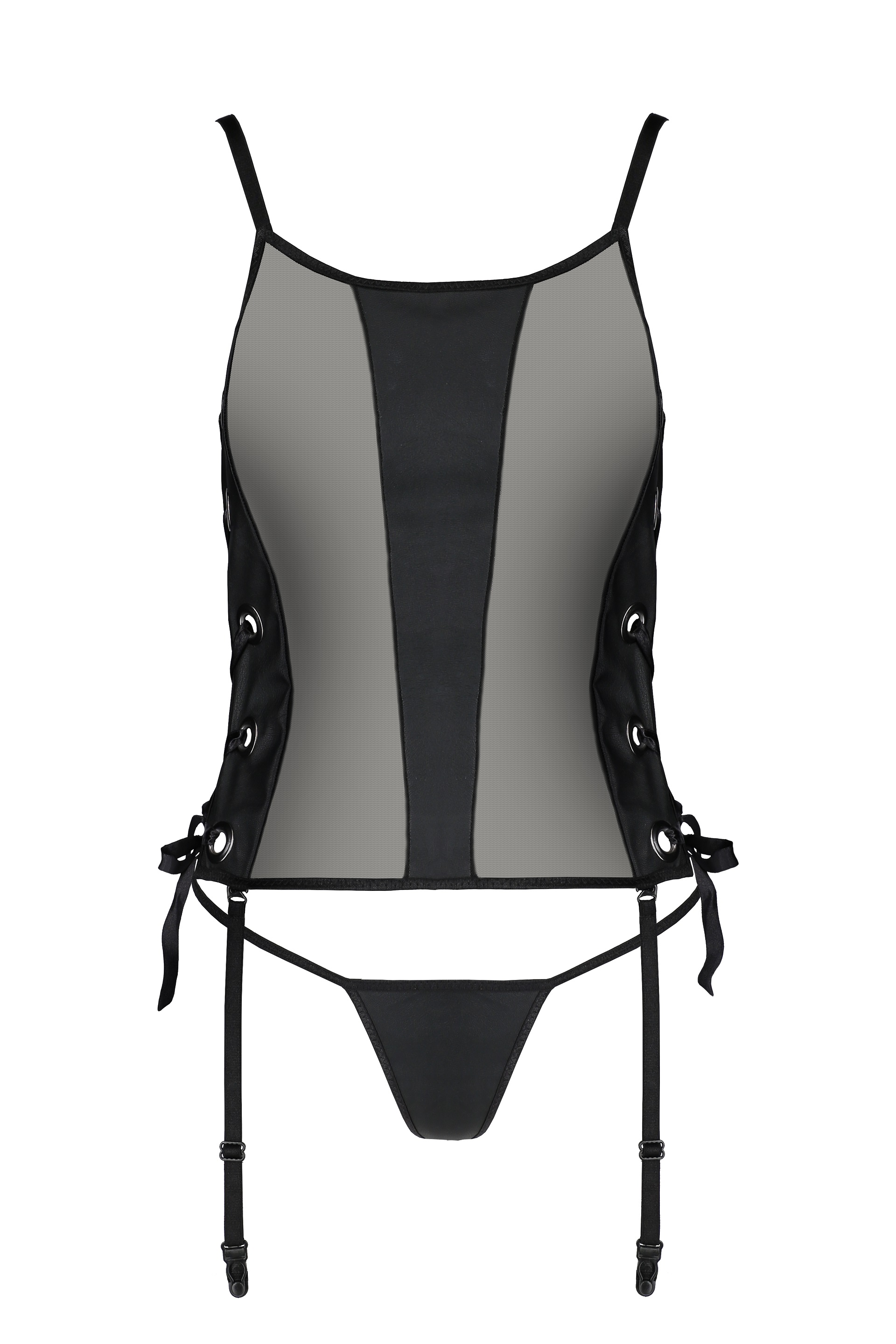 Strapscorsage aus schwarzem Tüll und Kunstleder. Mit verstellbaren Trägern und Schnürungen an den Seiten. Inklusive String, ohne Strümpfe. Verfügbare Größen: S/M, L/XL, XXL/3XL, 4XL/5XL, 6XL/7XL Fällt klein aus