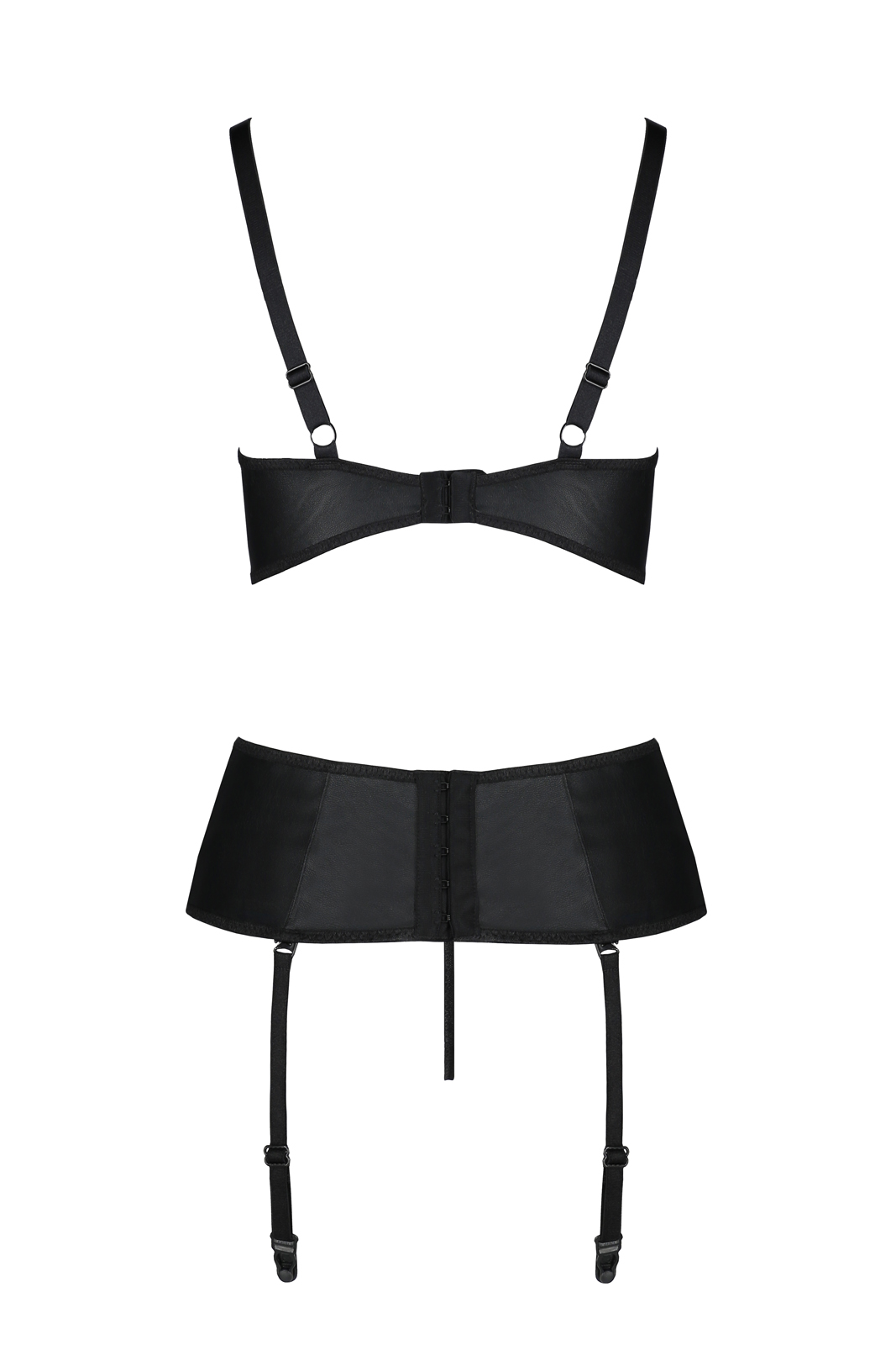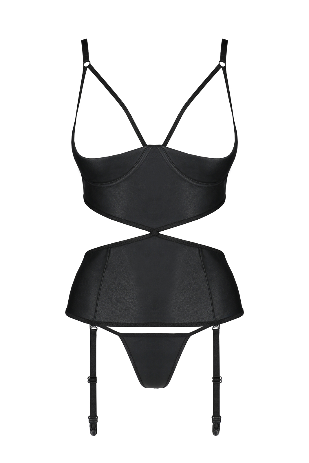 Strapscorsage aus schwarzem Kunstleder mit verstellbaren Trägern und Rückenverschluss. Die offenen Bügel-Cups sind leicht gepolstert. Die verstellbaren Strumpfhalter sind abnehmbar. Dazu ein passender String, ohne Strümpfe.