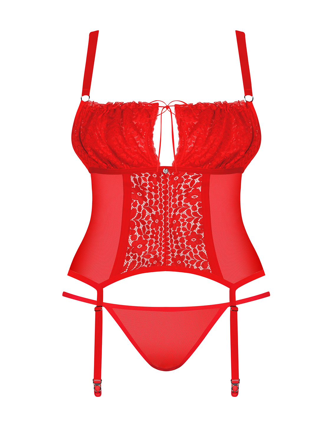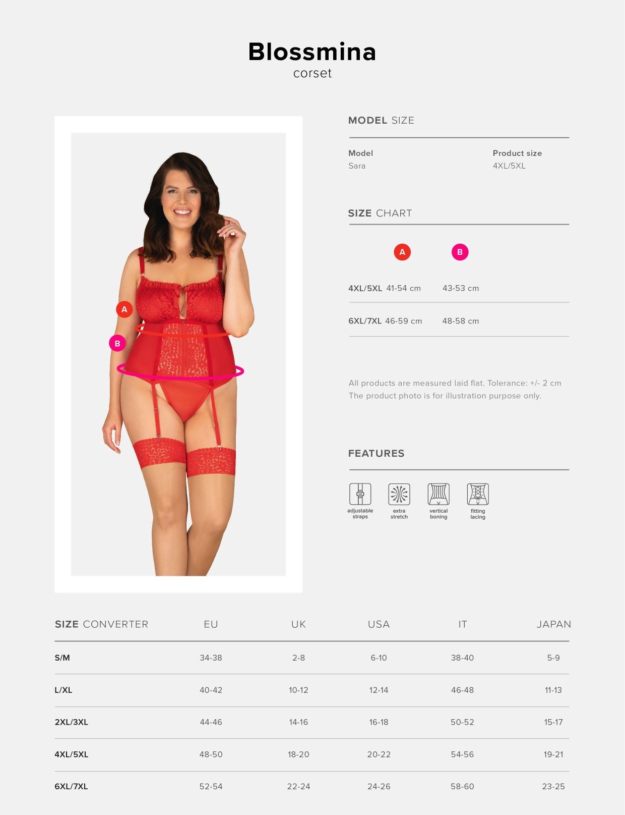 Rote Corsage in Übergrößen mit verstellbaren Strapsen. Mit verstellbaren Trägern und hinten mit einer Schnürung. Dazu ein passender String, ohne Strümpfe.