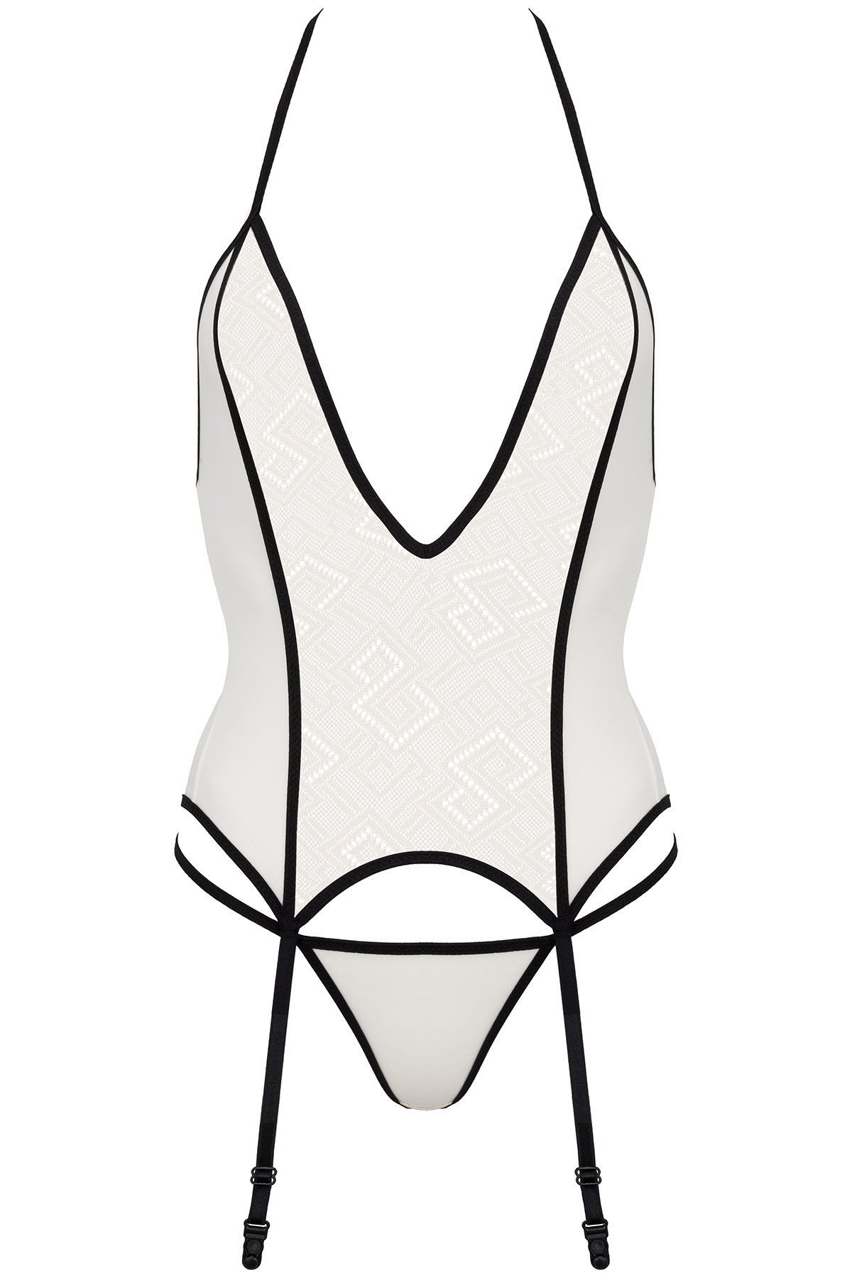 Strapscorsage aus beigefarbenem Stretch-Material. Rückenverschluss, Neckholder und Strumpfhalter sind verstellbar. Vorne transparent mit geometrischem Muster. Set mit einem passenden String, ohne Strümpfe.