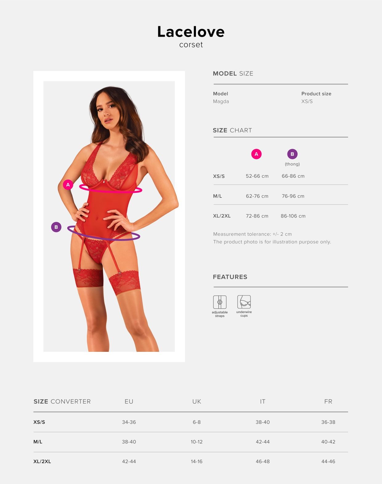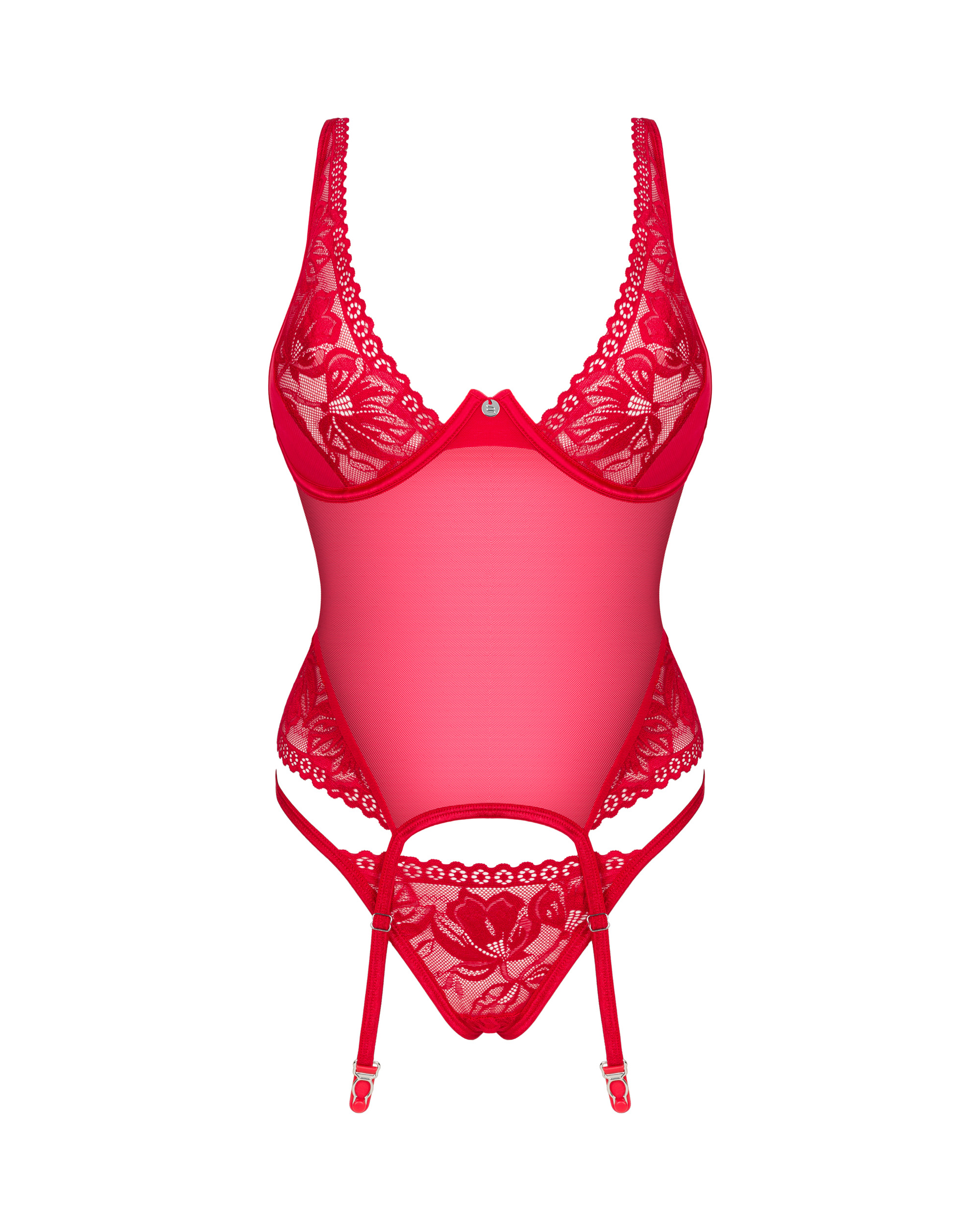 Rote Corsage aus transparentem Stoff mit eingearbeiteten Bügeln. Träger und Strumpfhalter sind verstellbar. Inklusive String, ohne Strümpfe.