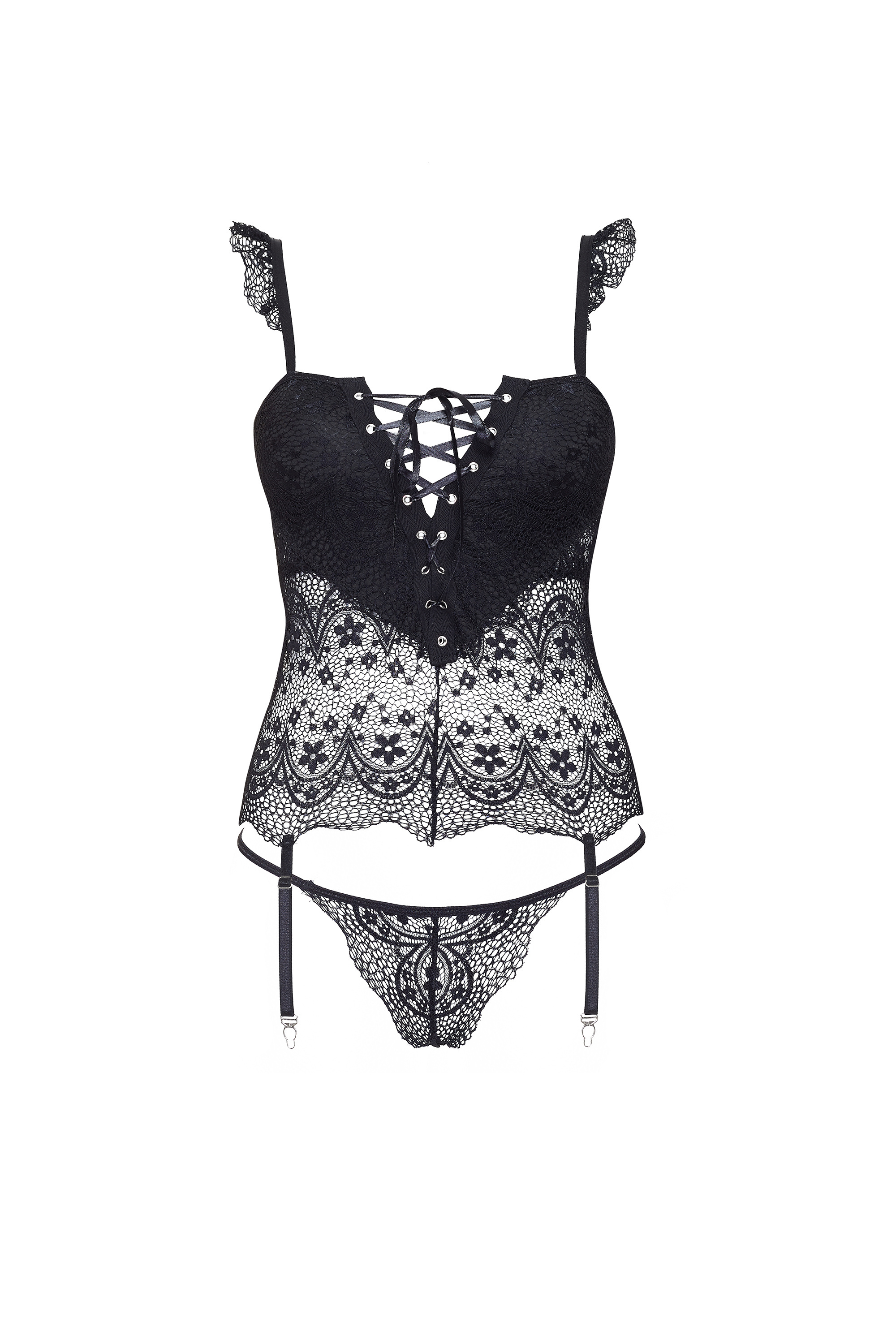 Strapscorsage in schwarz mit Schnürungen vorne und hinten. Träger und Strapsen sind verstellbar. Dazu ein passender String, ohne Strümpfe.