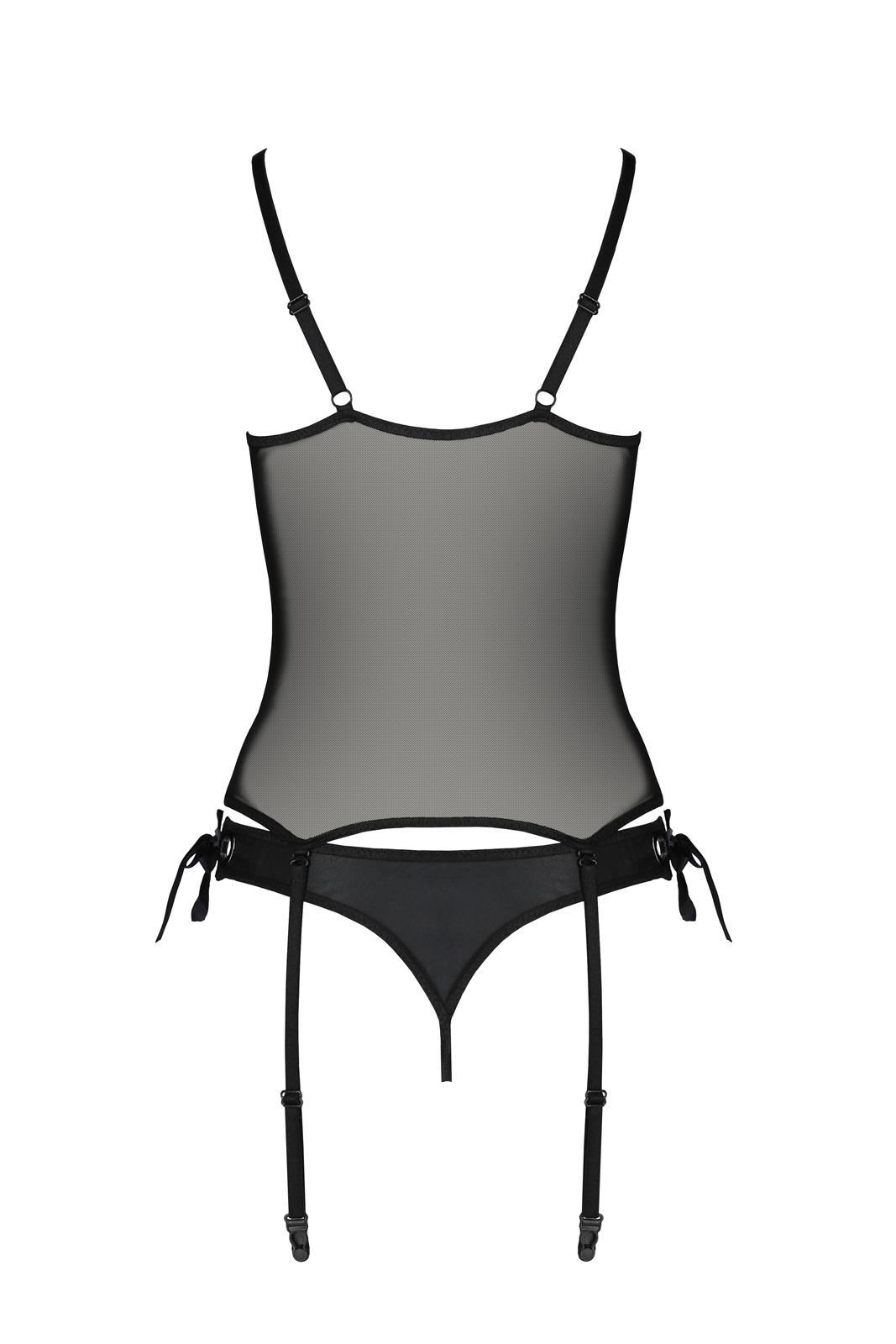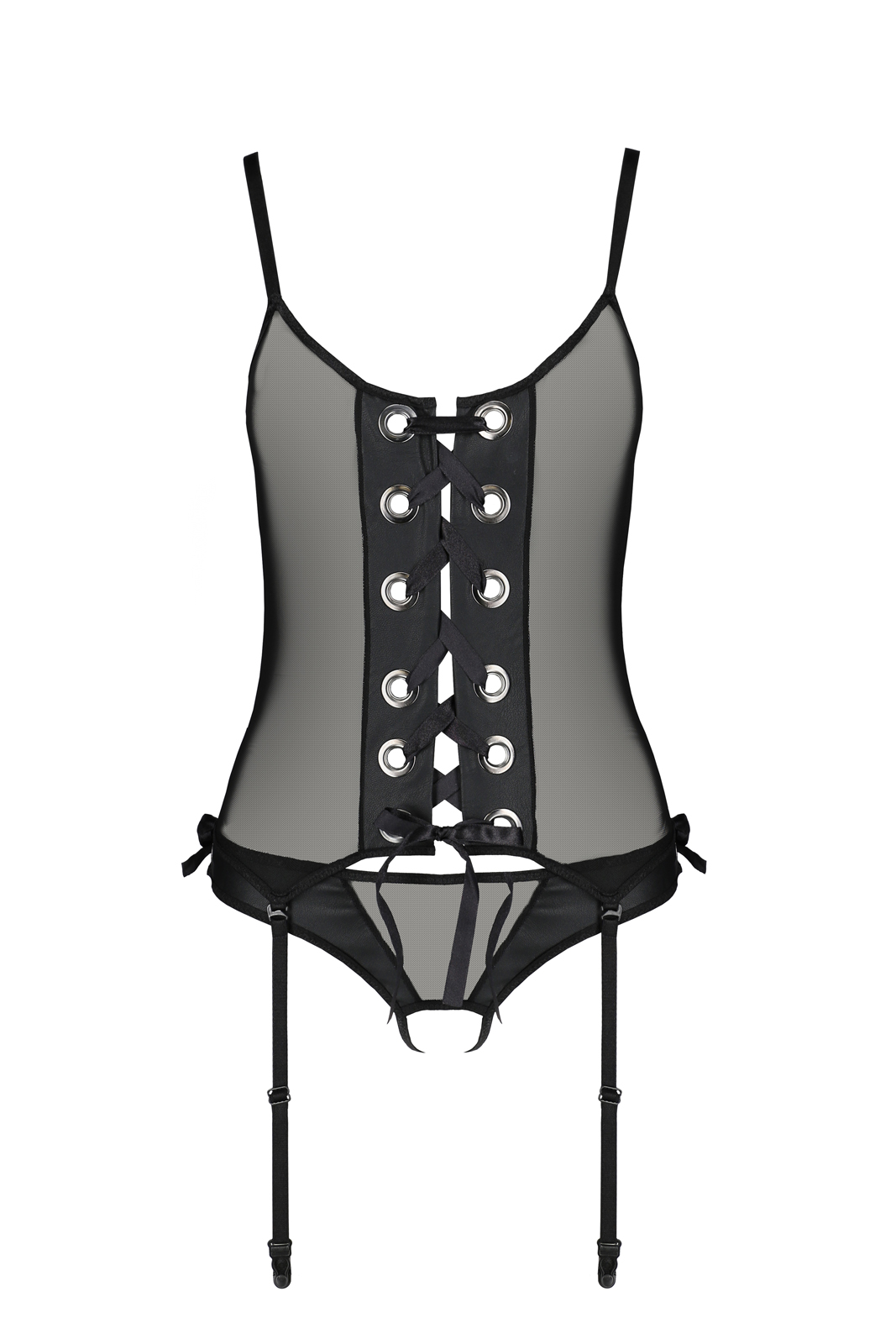 Schwarze Strapscorsage aus durchsichtigem Tüll. Vorne mit Kunstleder-Leisten und einer Schnürung. Die Träger und die abnehmbaren Strapshalter sind verstellbar. Inklusive Ouvert-String, ohne Strümpfe.