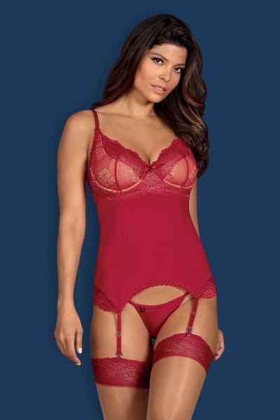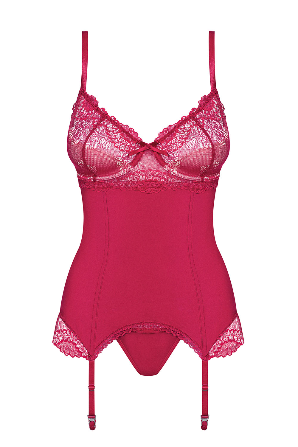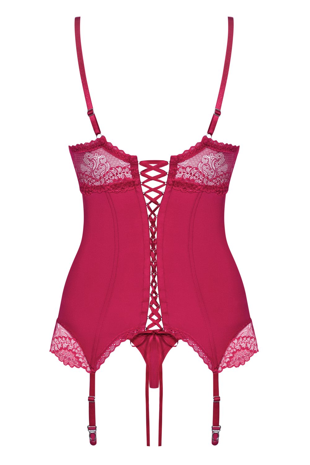Corsage in weinrot aus Stretch-Material mit Spitzenverzierung. Die gepolsterten Bügel-Cups haben verstellbare Träger. Über den gesamten Rücken mit einer Schnürung für einen leicht figurformenden Effekt. Passender String inklusive, ohne Strümpfe.