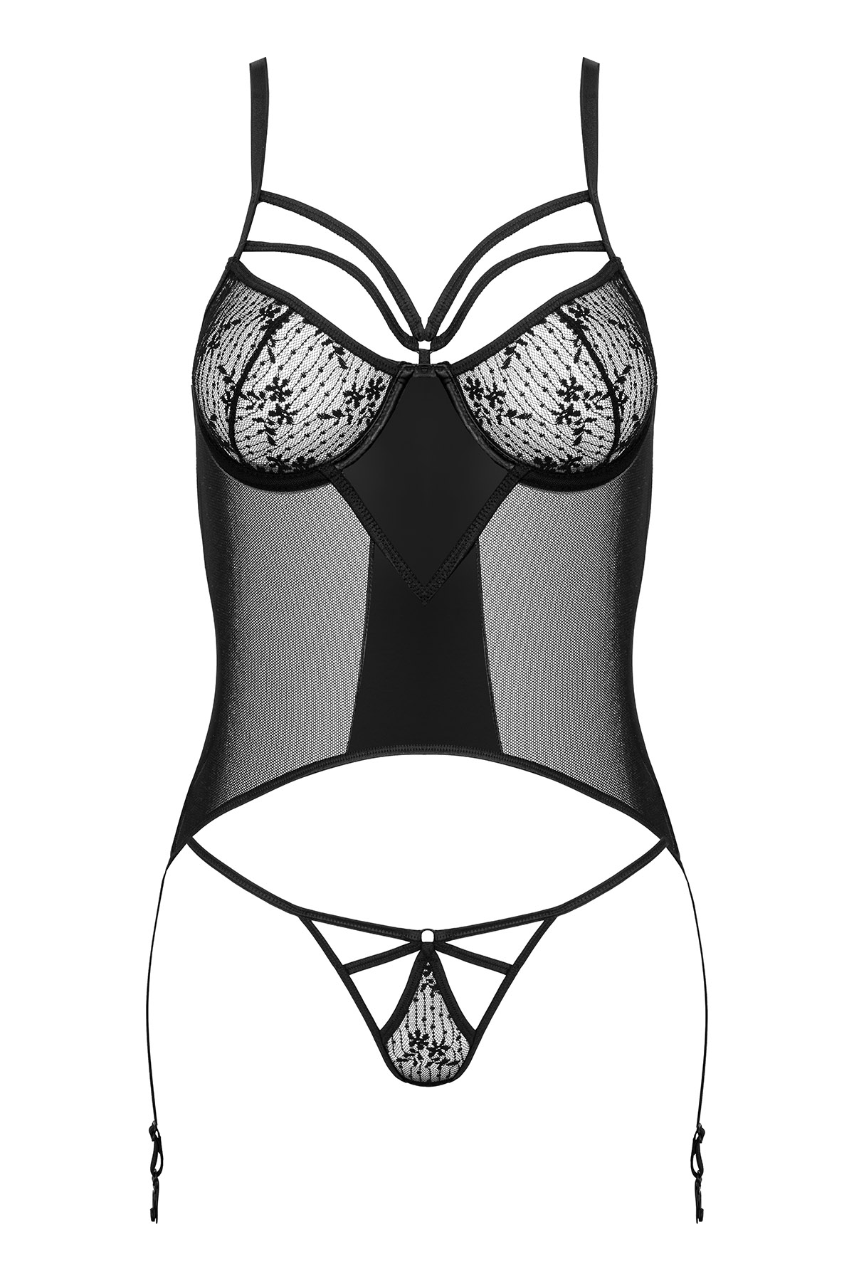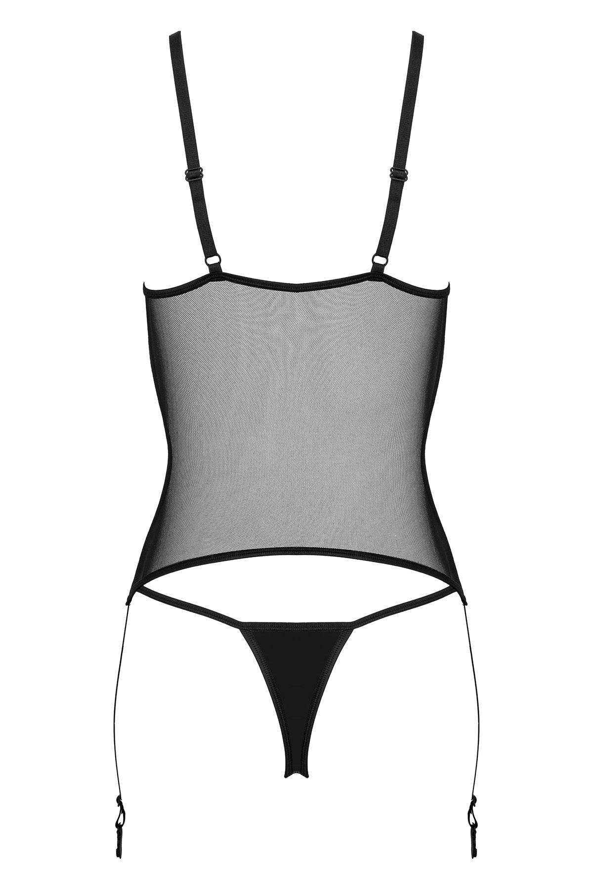 Schwarze Corsage aus transparentem Tüll und Wetlook-Material. Mit eingearbeiteten Bügeln und verstellbaren Trägern. Inklusive passendem String, ohne Strümpfe. Verfügbare Größen: S/M, L/XL