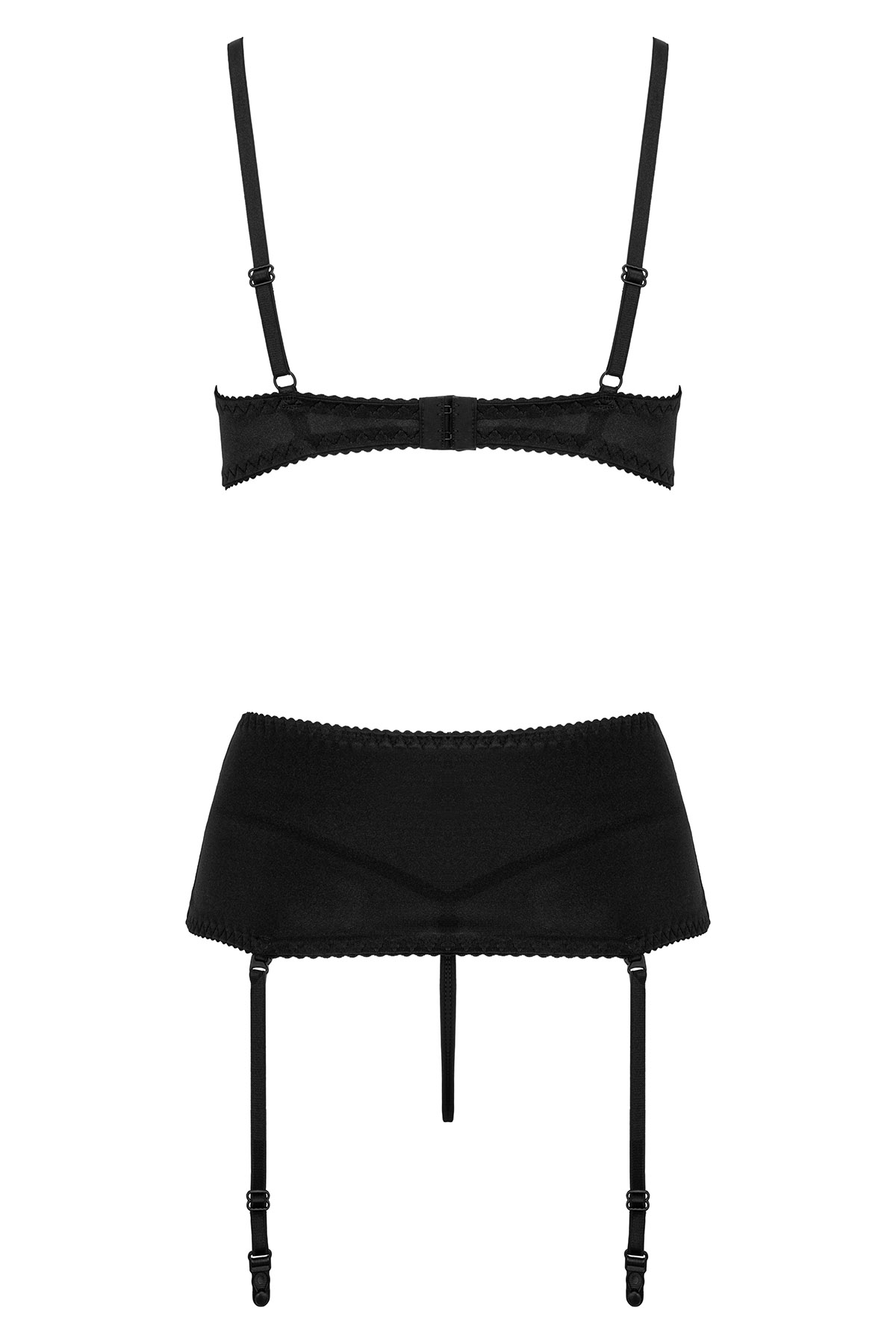 Offenes Straps-Set in schwarz-silber aus glänzendem Stretch-Material und zarter Blütenspitze. Hebe-BH mit verstellbaren Trägern und zweifachem Häckchenverschluss. Hüftgürtel mit abnehmbaren und verstellbaren Strapshaltern. Vorne mit einer dekorativen Schnürung. Im gleichen Design ein passender offener String.