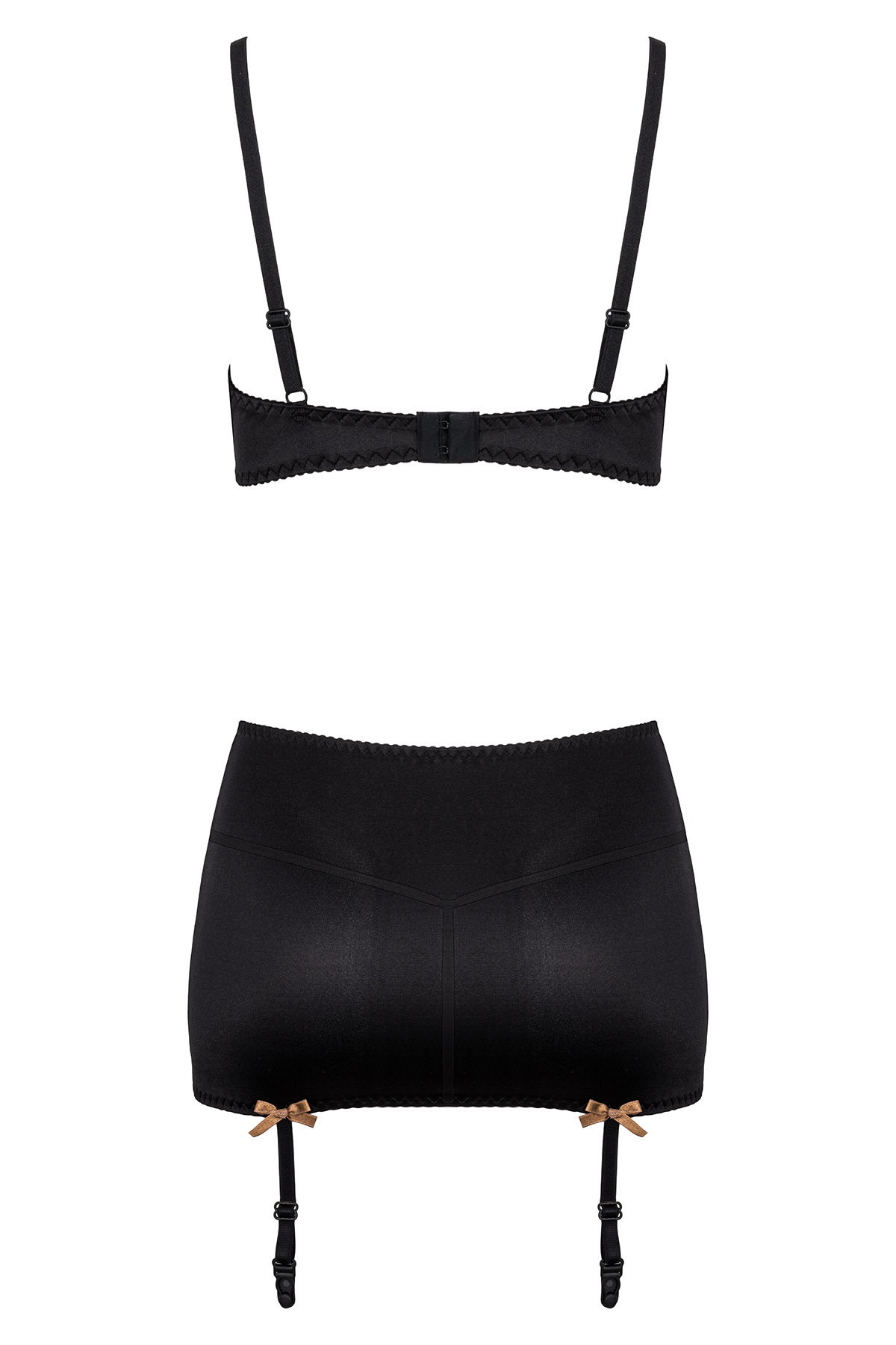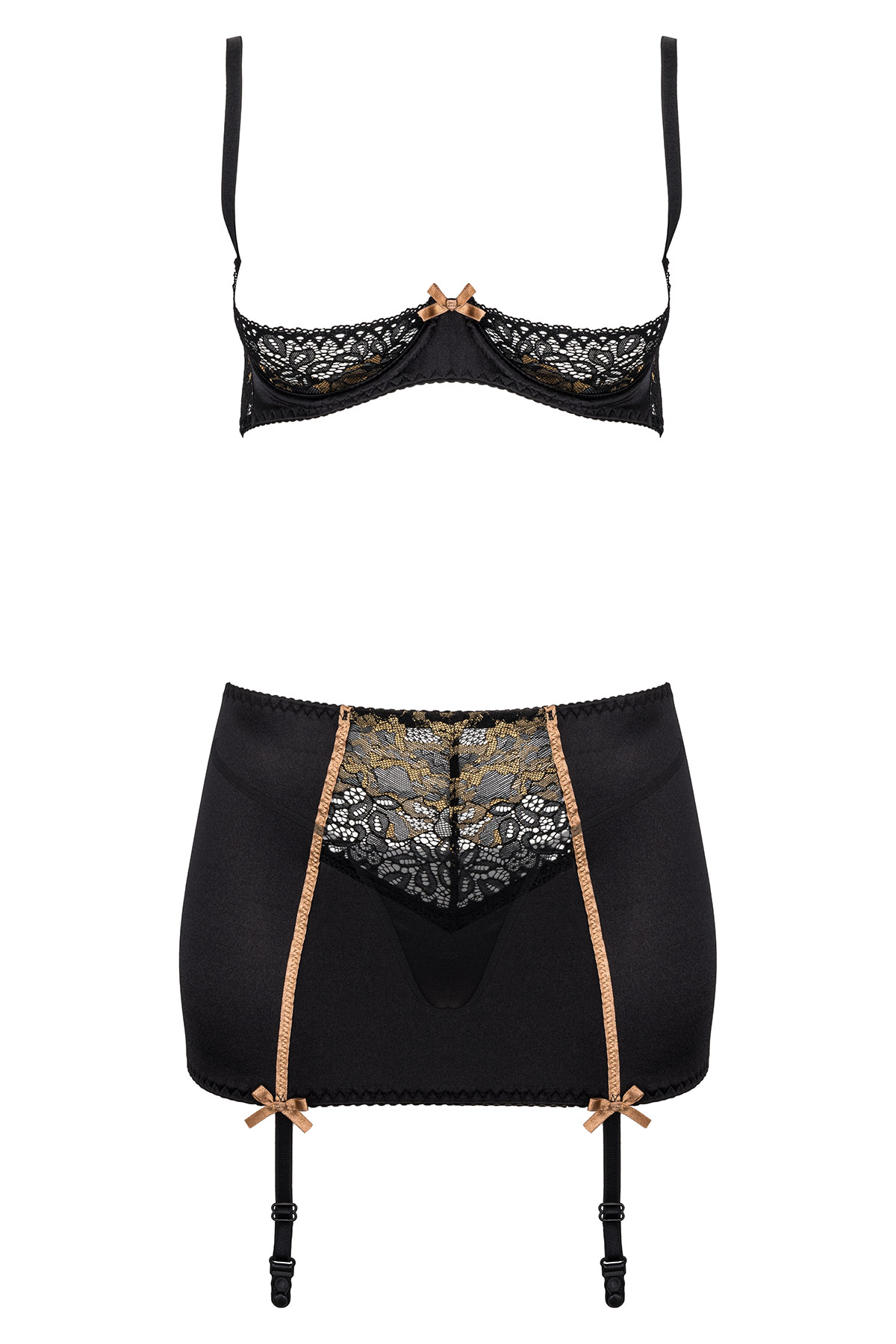Offenes Straps-Set in schwarz-bronze mit tollen Details aus edlem Satin und zarter Spitze. Hebe-BH mit verstellbaren Trägern und zweifachem Häckchenverschluss. Enganliegender und figurbetonter breiter Hüftgürtel mit verstellbaren Strapshaltern. Set mit passendem String. Verfügbare Größen: S/M, L/XL