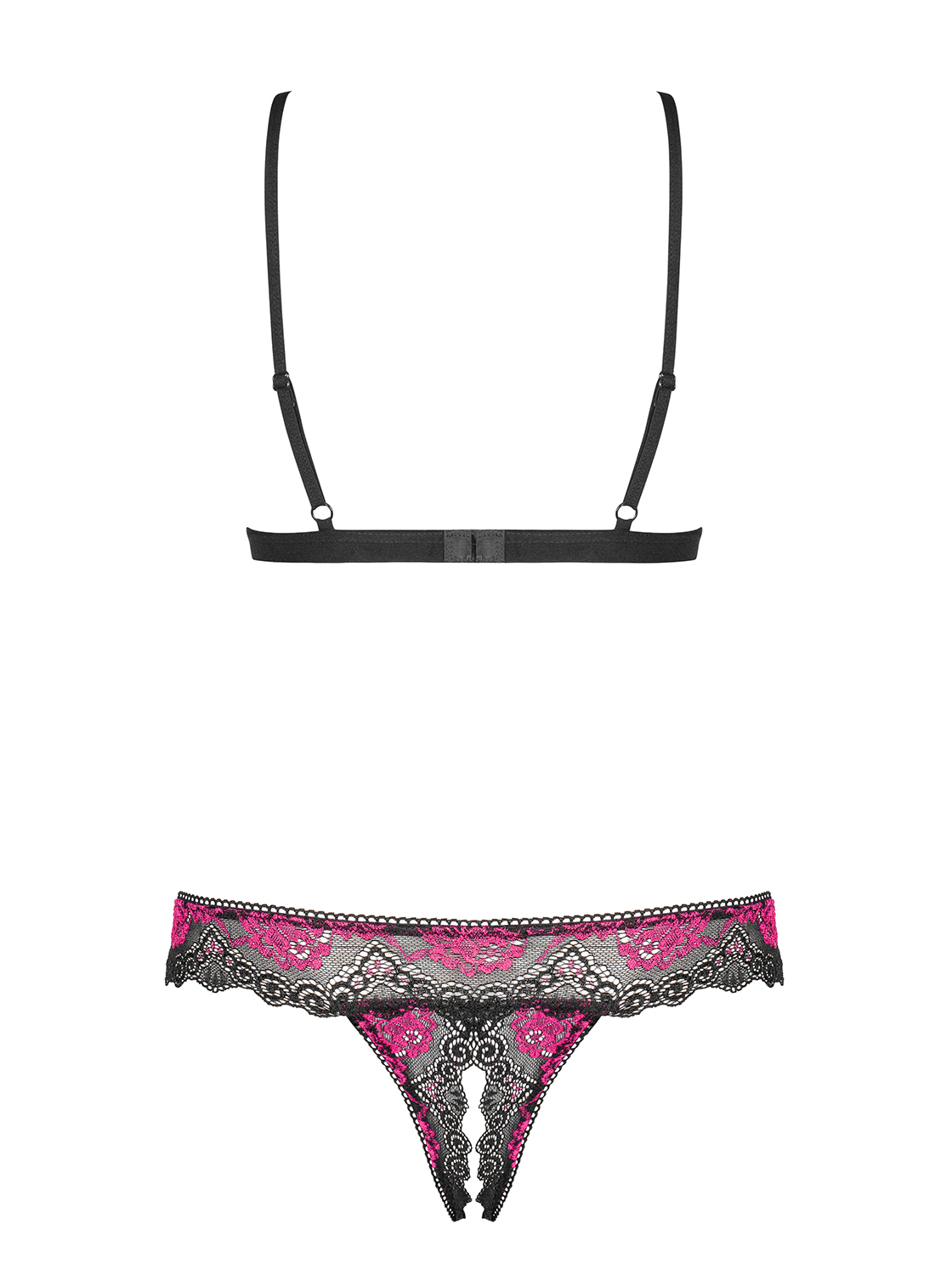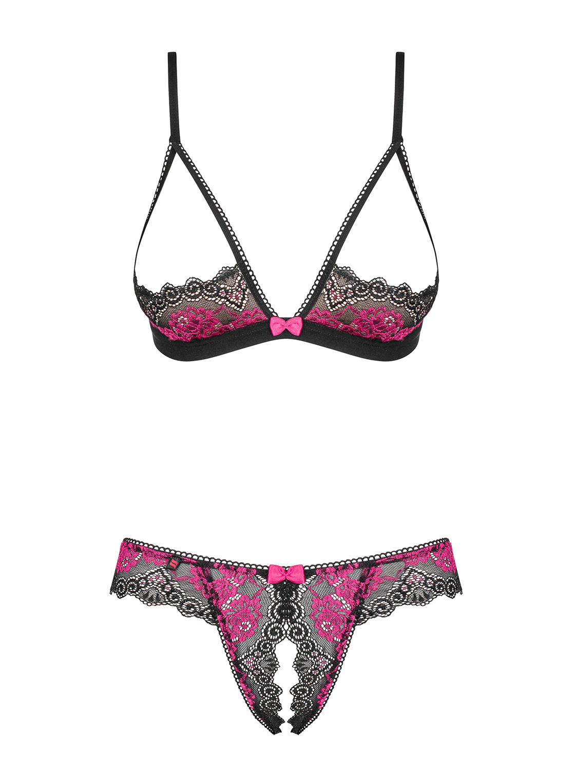 Schwarzes Reizwäsche-Set mit pinkem Blumenmuster. Der offene Bügel-BH hat verstellbare Träger und... mehr
