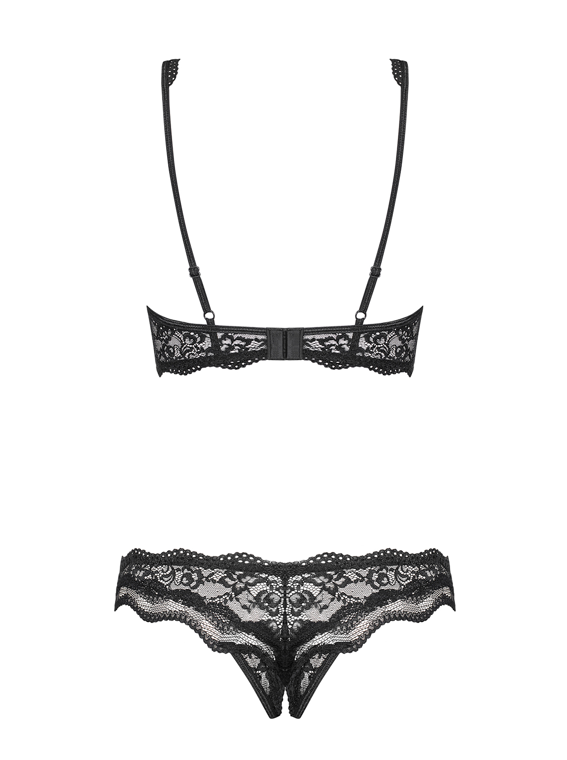 Schwarzes Dessous-Set mit Spitze aus elastischem Material. Der offene Bügel-BH hat verstellbare... mehr