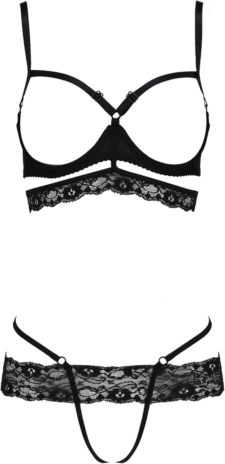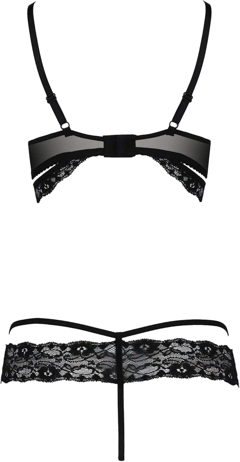 Brustfrei-Set in schwarz aus weichem Tüll und zarter Spitze. Der BH hat verstellbare Trägern und Riemchen über der Brust. Unterhalb der Brust mit Spitze verziert. Hinten mit einem zweifach verstellbaren Hakenverschluss. Dazu ein Ouvert-String mit einem breiten Spitzenrand, ohne Strümpfe. Verfügbare Größen: S/M, L/XL
