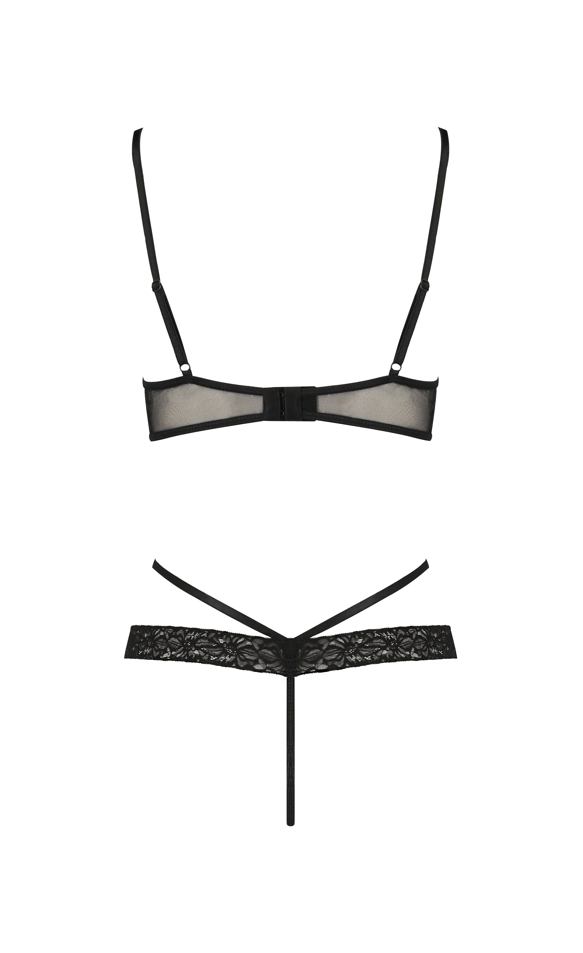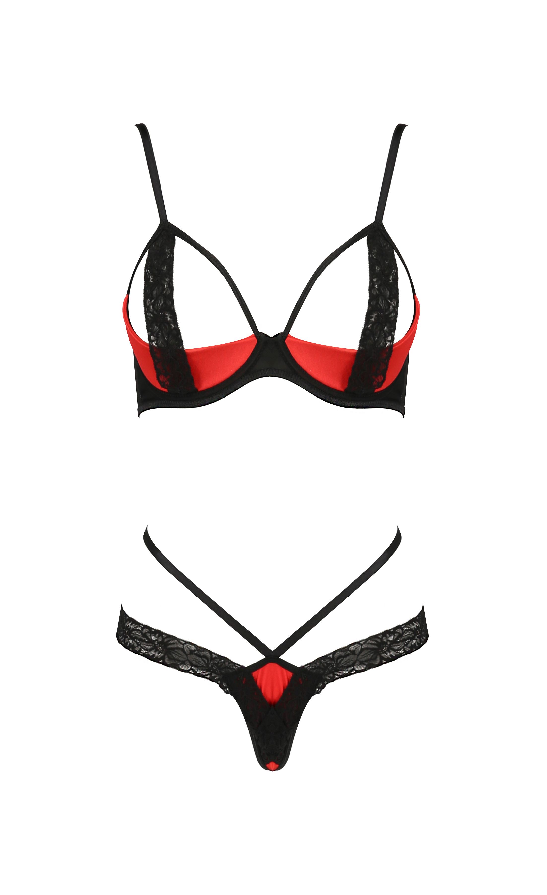 Schwarz-rotes BH-Set mit Streifen aus Spitze über der Brust. Der Bügel-BH hat gepolsterte Cups und wird auf der Rückseite geschlossen. Der String ist im gleichen Design. Verfügbare Größen: S/M, L/XL
