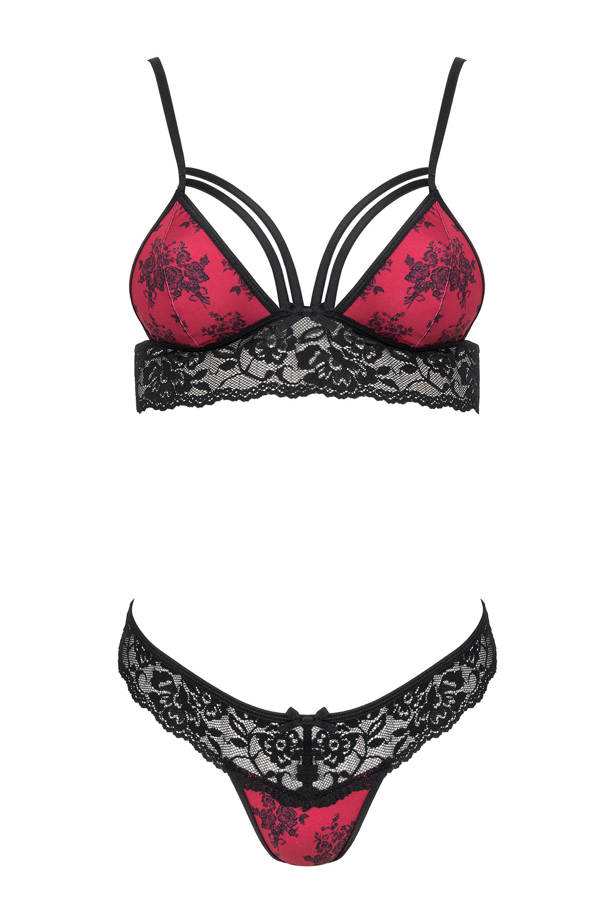 Dessous-Set aus rotem Satin und schwarzer Spitze mit einem Blumenmuster. Der BH hat verstellbare Träger und einen verstellbaren Hakenverschluss. Der String ist im gleichen Style gehalten. Fällt klein aus.
