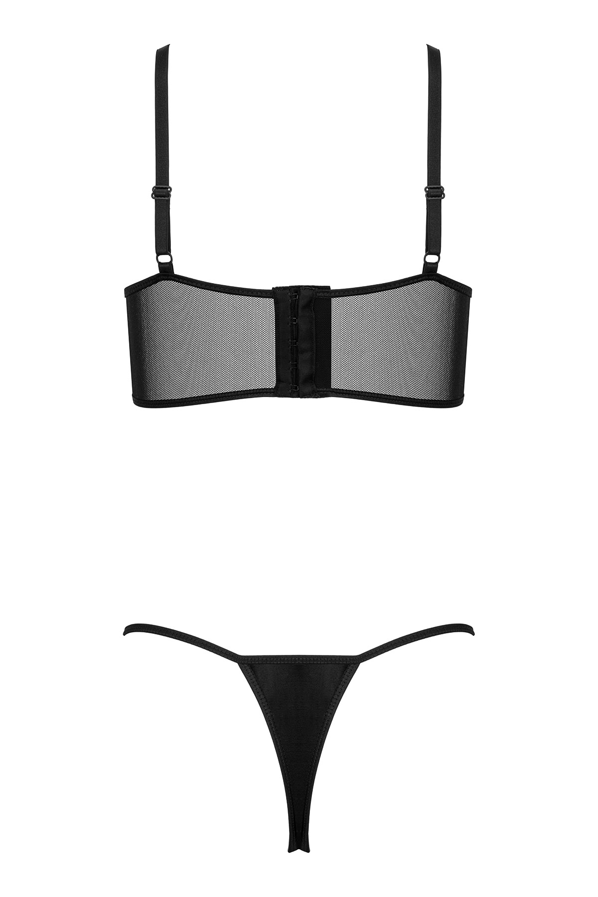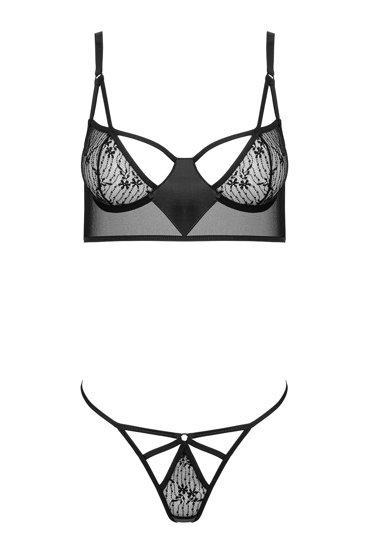 Reizwäsche-Set in schwarz aus transparentem Tüll mit Blumenmuster. Der Bügel-BH hat verstellbare Träger und einen verstellbaren Rückenverschluss. Der String ist hinten aus Wetlook-Material. Verfügbare Größen: S/M, L/XL