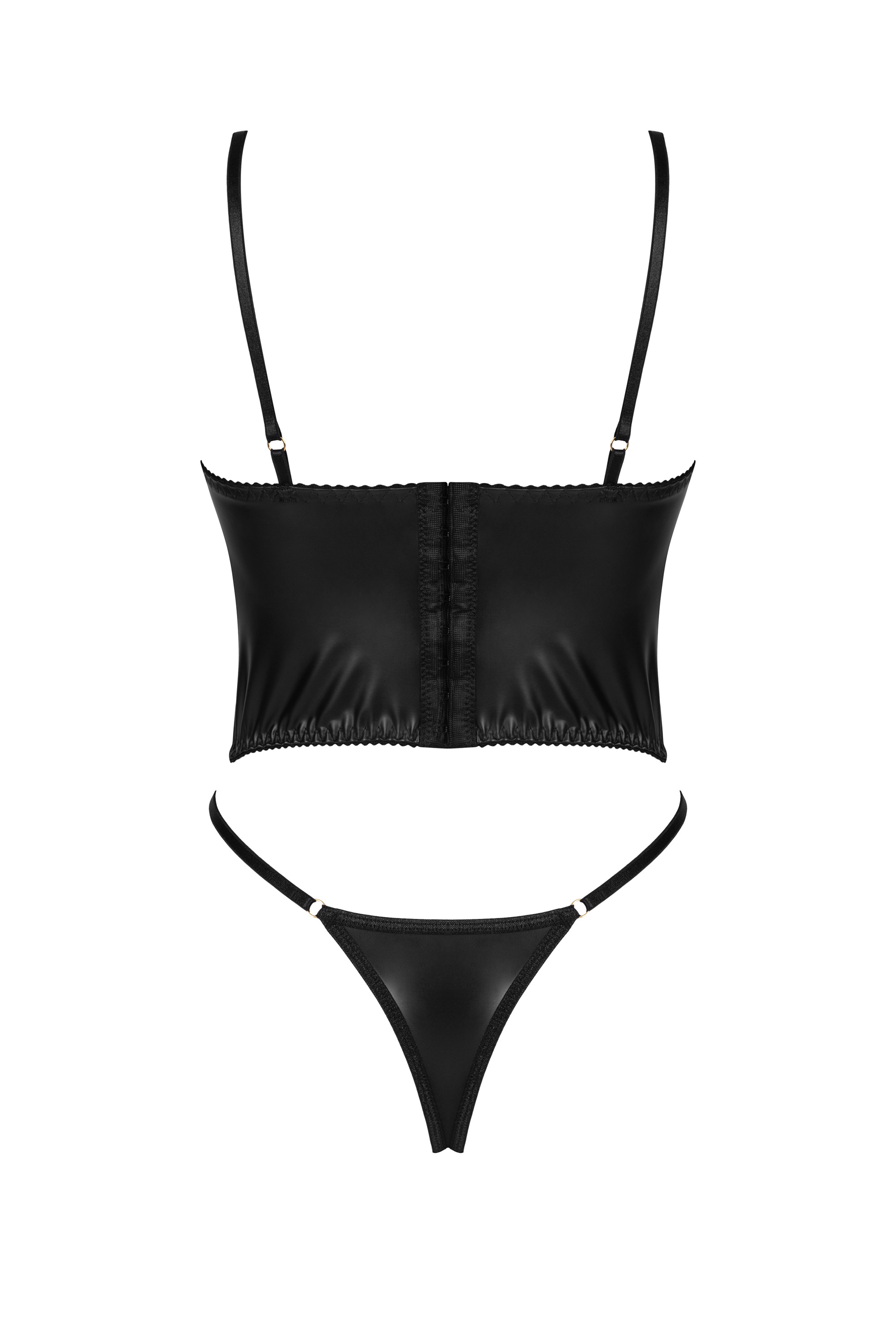 Schwarzes Kunstleder-Set mit Bügel-Top und String. Das Bustier ist individuell verstellbar und hat vorne Zierschnürungen.