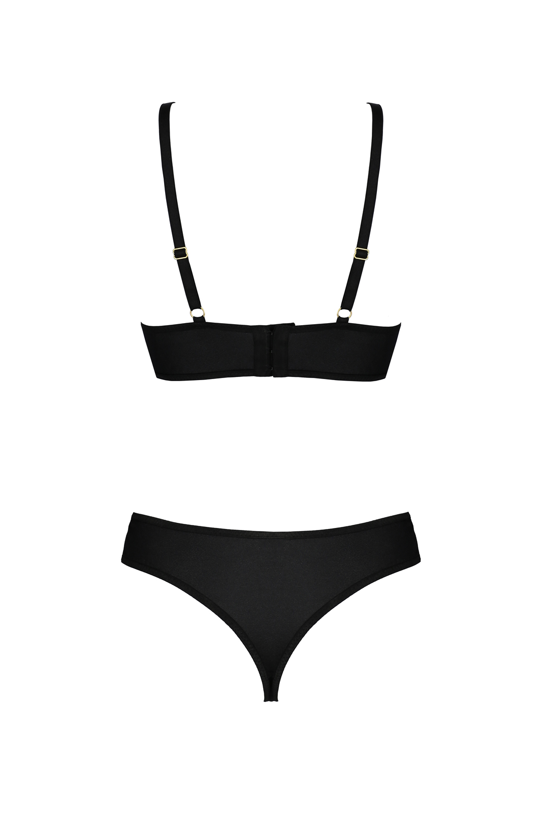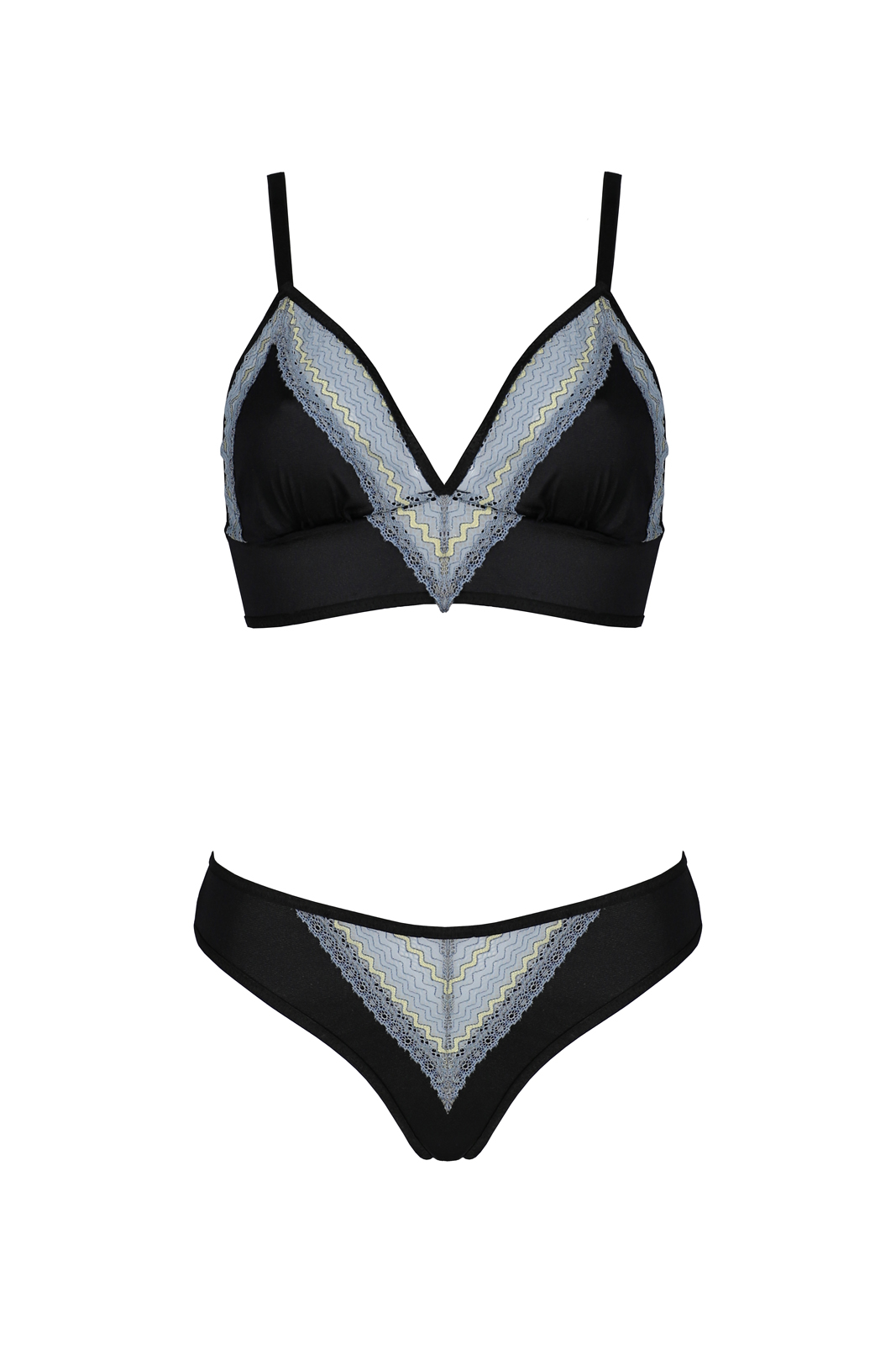 Schwarzes BH-Set aus seidig-glänzendem Stoff mit grau-blauer Spitze. Der Bustier-BH hat keine Bügel und ist individuell einstellbar. Inklusive Panty im gleichen Design.