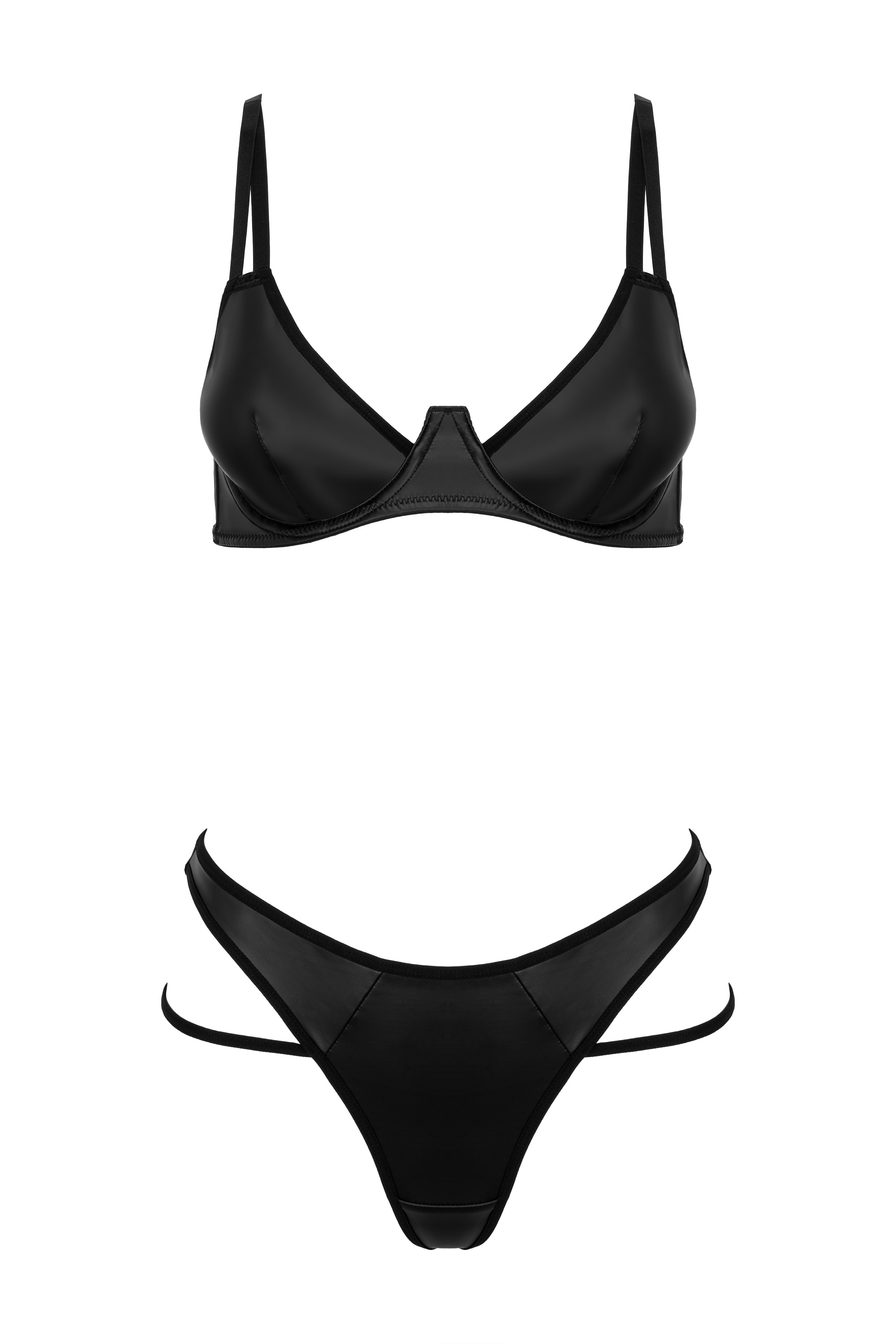 Wetlook-Set in schwarz mit Bügel-BH, der mehrfach verstellbar ist. Der String ist mit elastischen Riemen versehen.