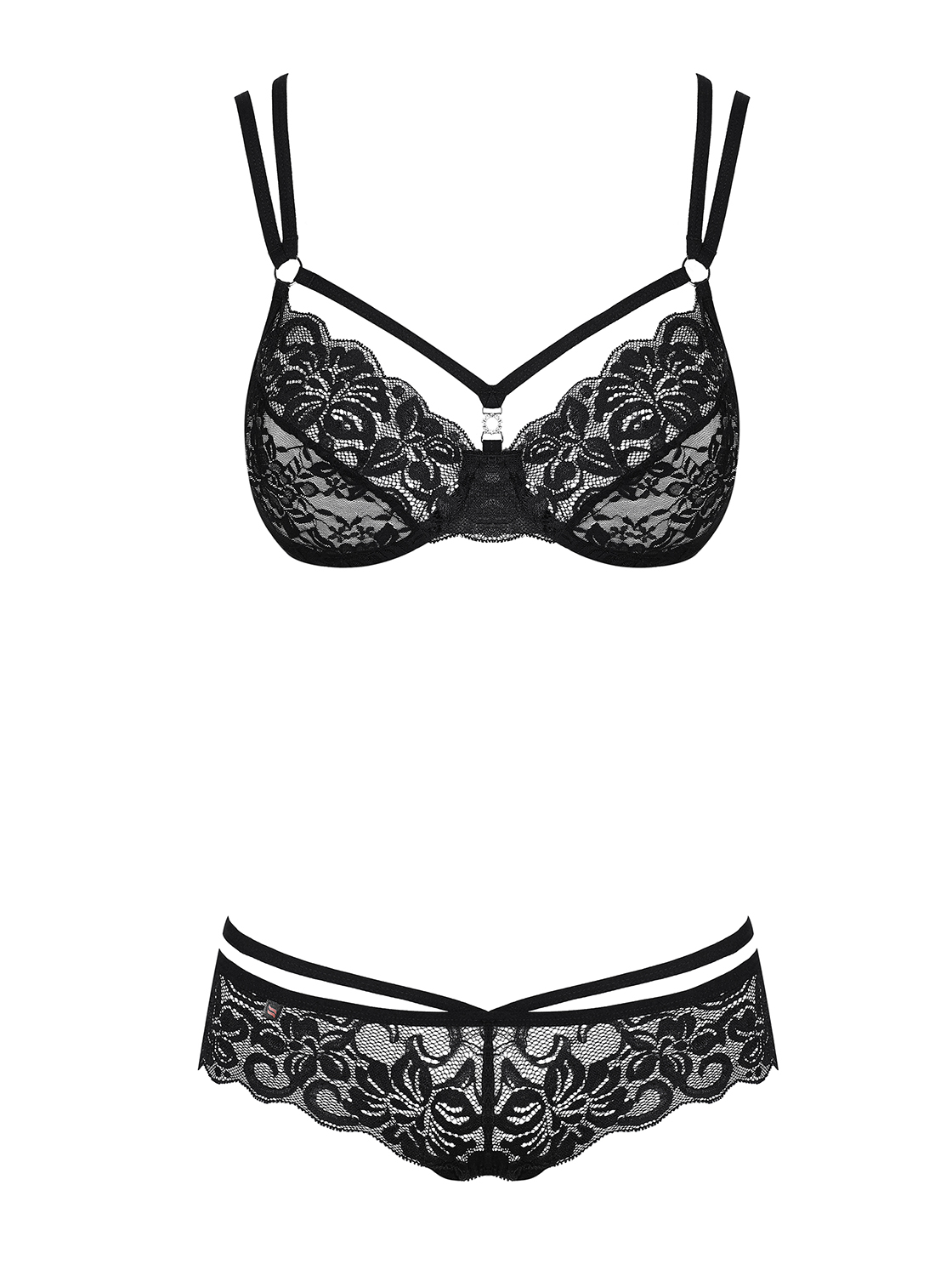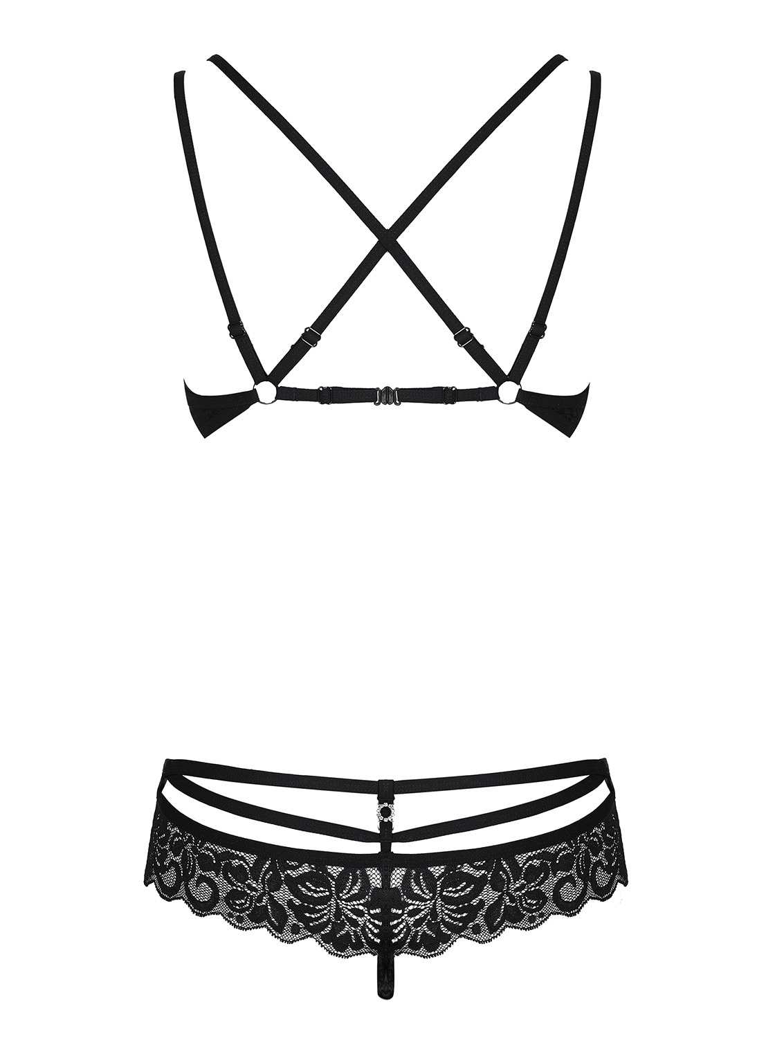 Schwarzes Dessous-Set aus Spitze mit String und Bügel-BH. Mit Stretch-Riemchen an beiden Teilen jeweils vorne und hinten. In der Mitte zwischen den Körbchen mit Schmuck. Verfügbare Größen: S/M, L/XL