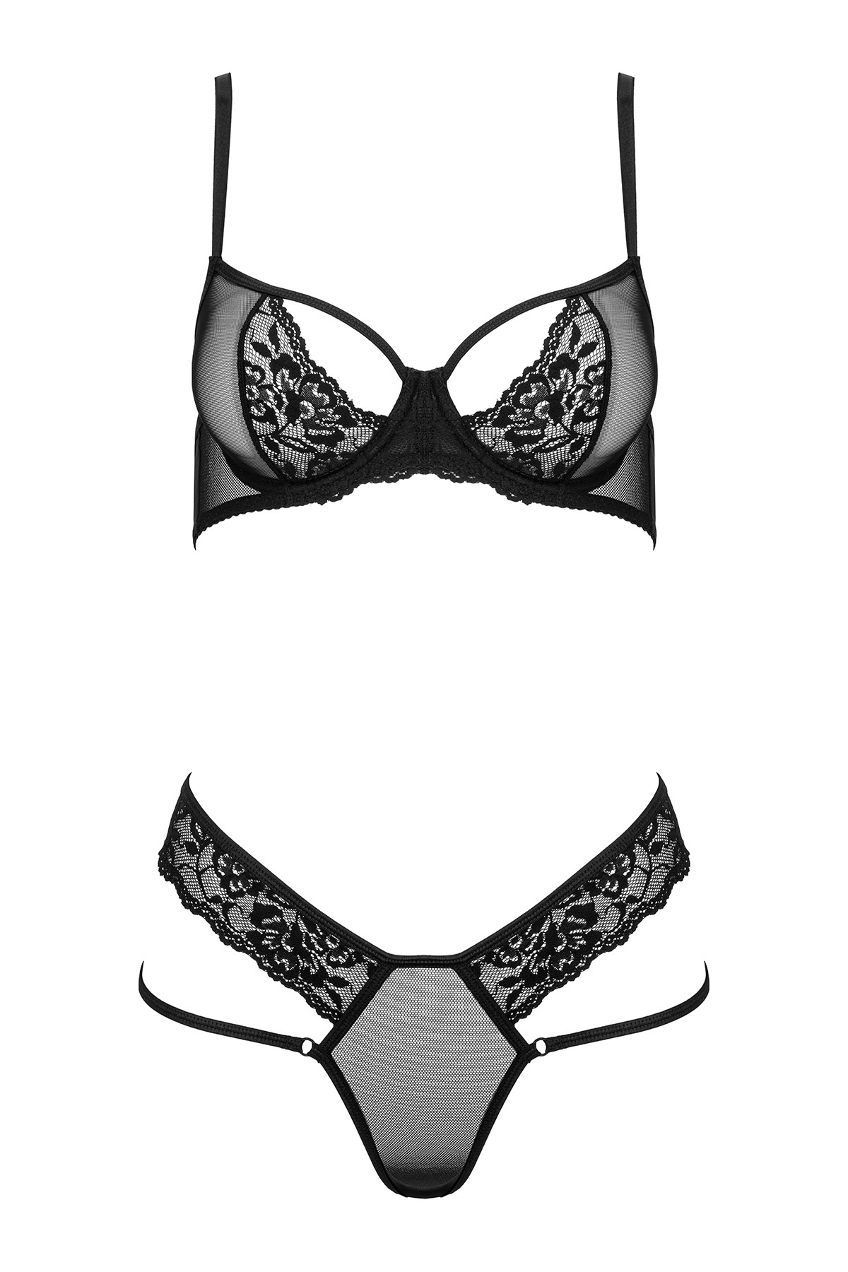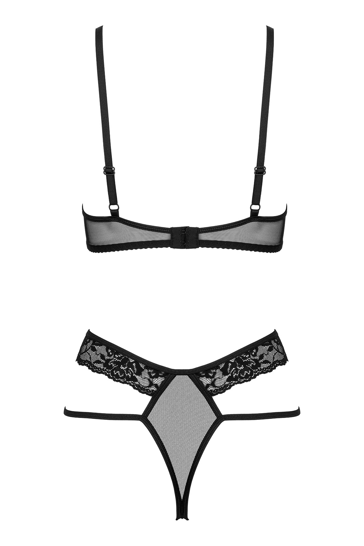 BH-Set in schwarz mit Blumenmuster. Der Bügel-BH hat verstellbare Träger und einen verstellbaren Hakenverschluss. Aus elastischem, transparentem Material genäht. Im Set ein passender String mit Spitze.