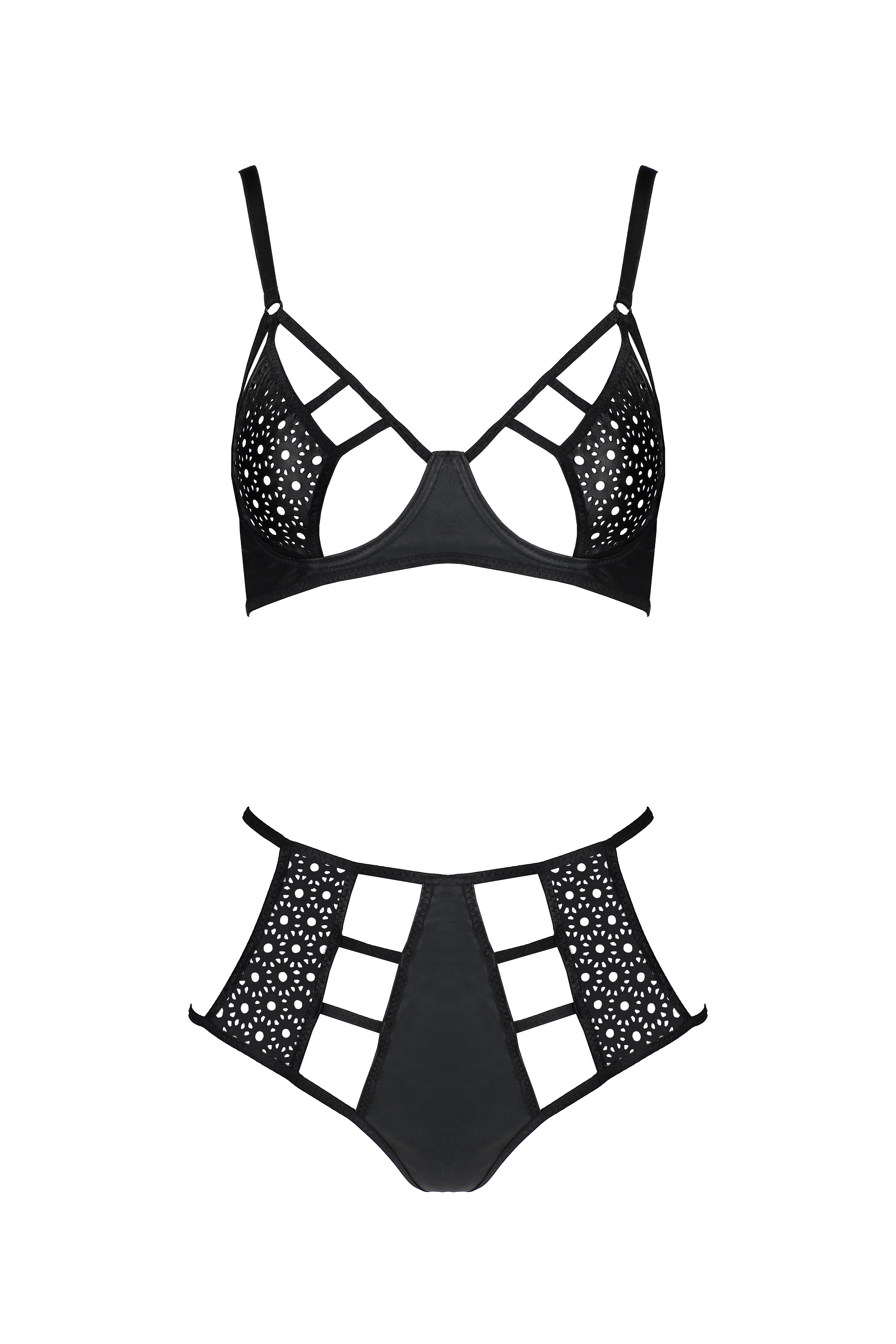 Schwarzes Kunstleder-Set mit Bügel-BH und String. Das Top ist vorne aus einem Material mit Lochmuster gefertigt. Mit verstellbaren Trägern und einem verstellbaren Rückenverschluss. Der High-Waist String ist im gleichen Design und hat hinten eine Schnürung.