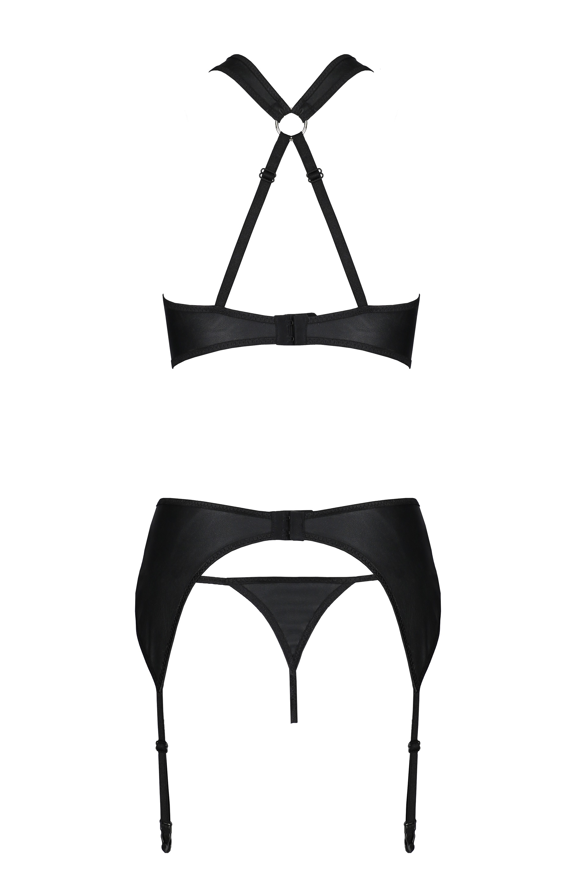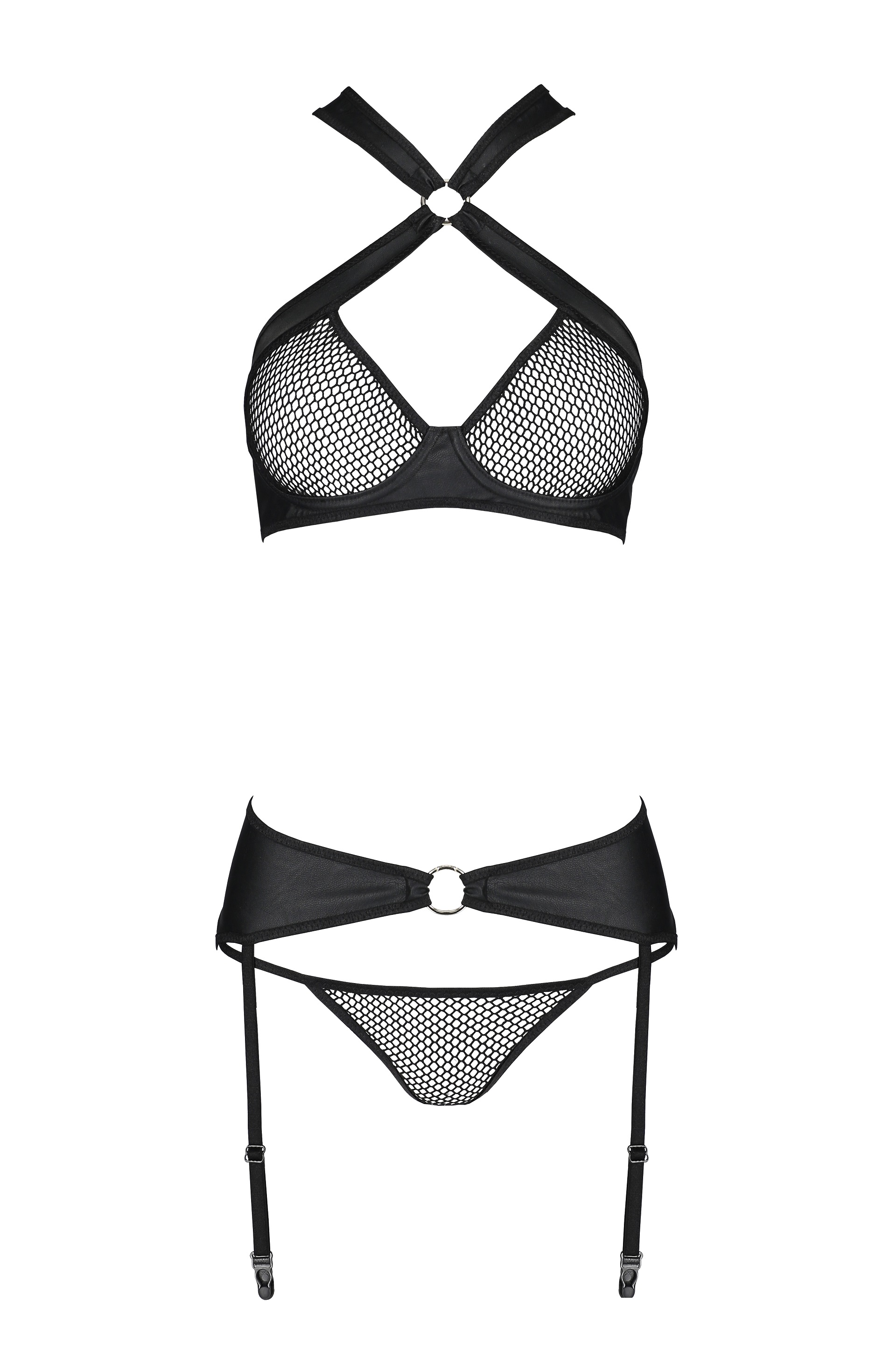 Schwarzes Dessous-Set aus elastischem Netz und Wetlook-Material. Der Bügel-BH hat verstellbare Träger. BH und Strapsgürtel haben verstellbare Rückenverschlüsse. Die Strapshalter sind verstellbar. Im Set ein String, ohne Strümpfe.