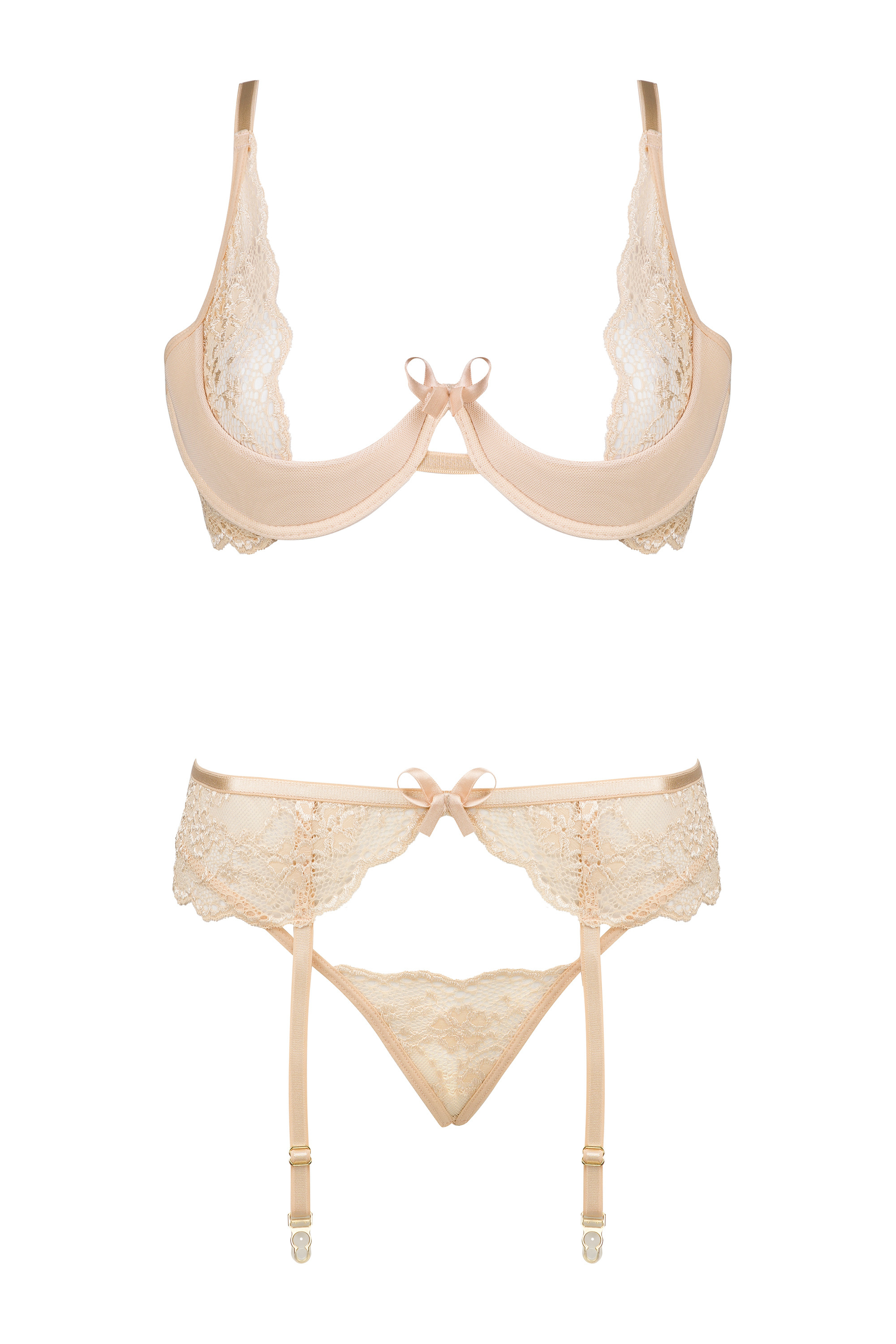 Beigefarbenes Dessous-Set aus edler Spitze. Der gepolsterte Bügel-BH ist mehrfach verstellbar. Mit String und verstellbarem Strumpfgürtel, ohne Strümpfe. Verziert mit floralen Motiven und Satinschleifchen.