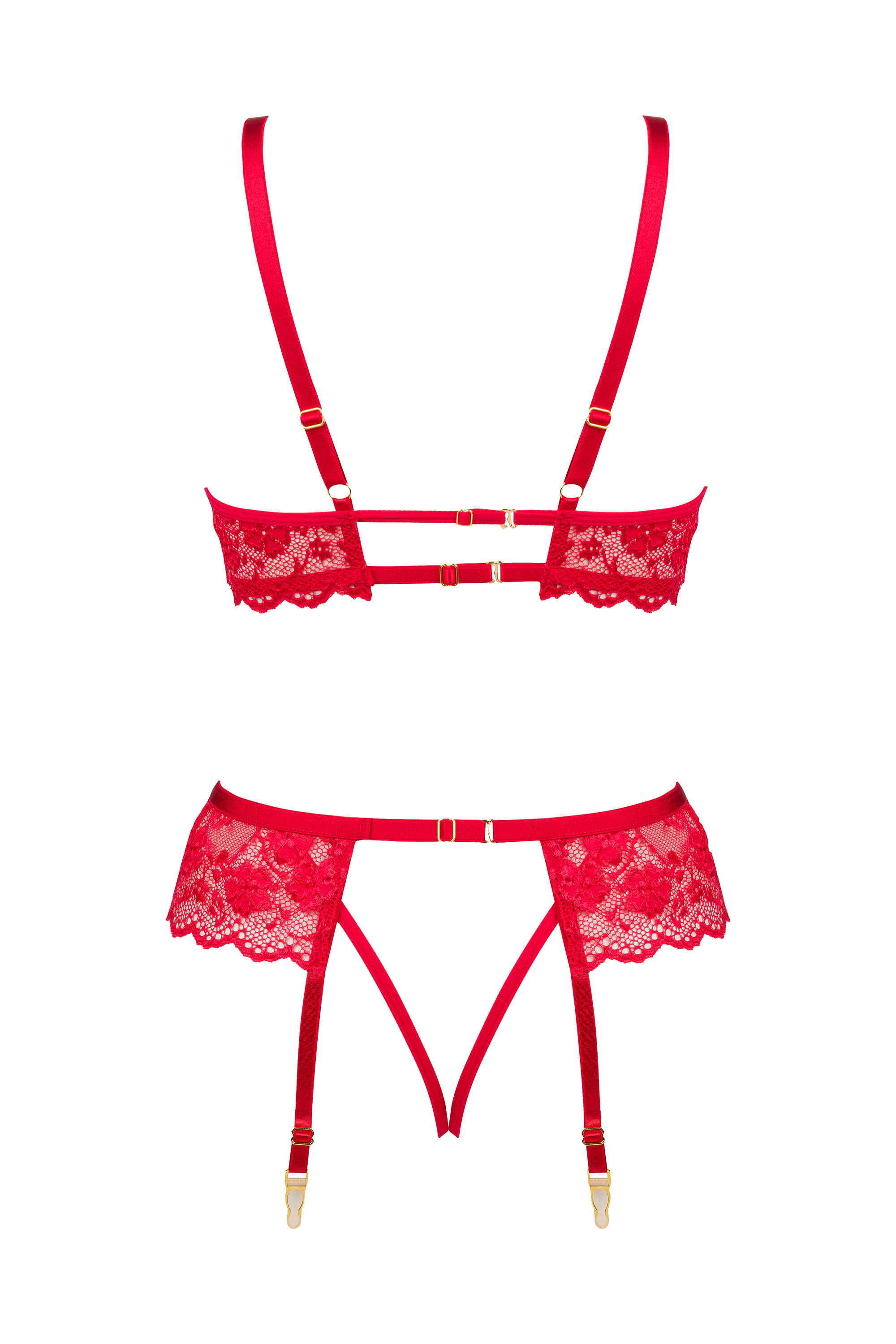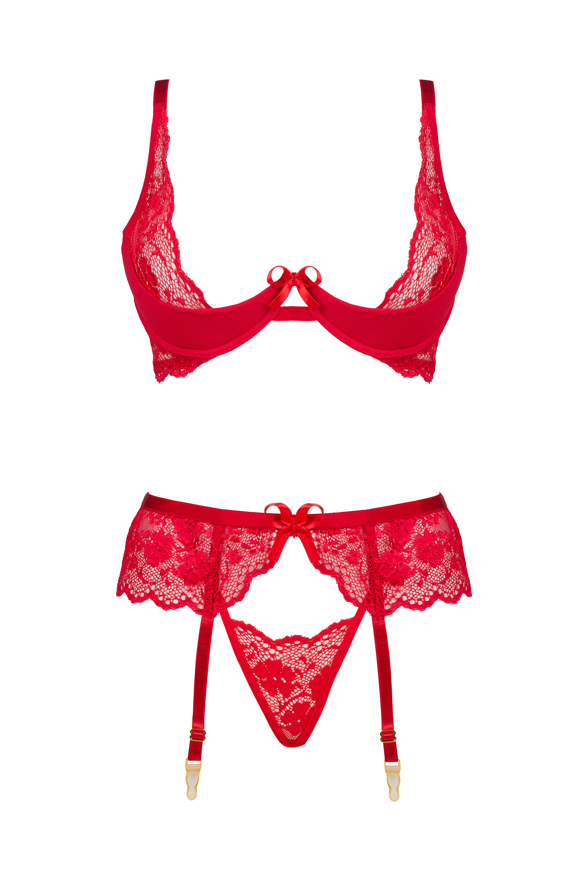 Rotes Dessous-Set aus edler Spitze. Der gepolsterte Bügel-BH ist mehrfach verstellbar. Mit String und verstellbarem Strumpfgürtel, ohne Strümpfe. Verziert mit floralen Motiven und Satinschleifchen.