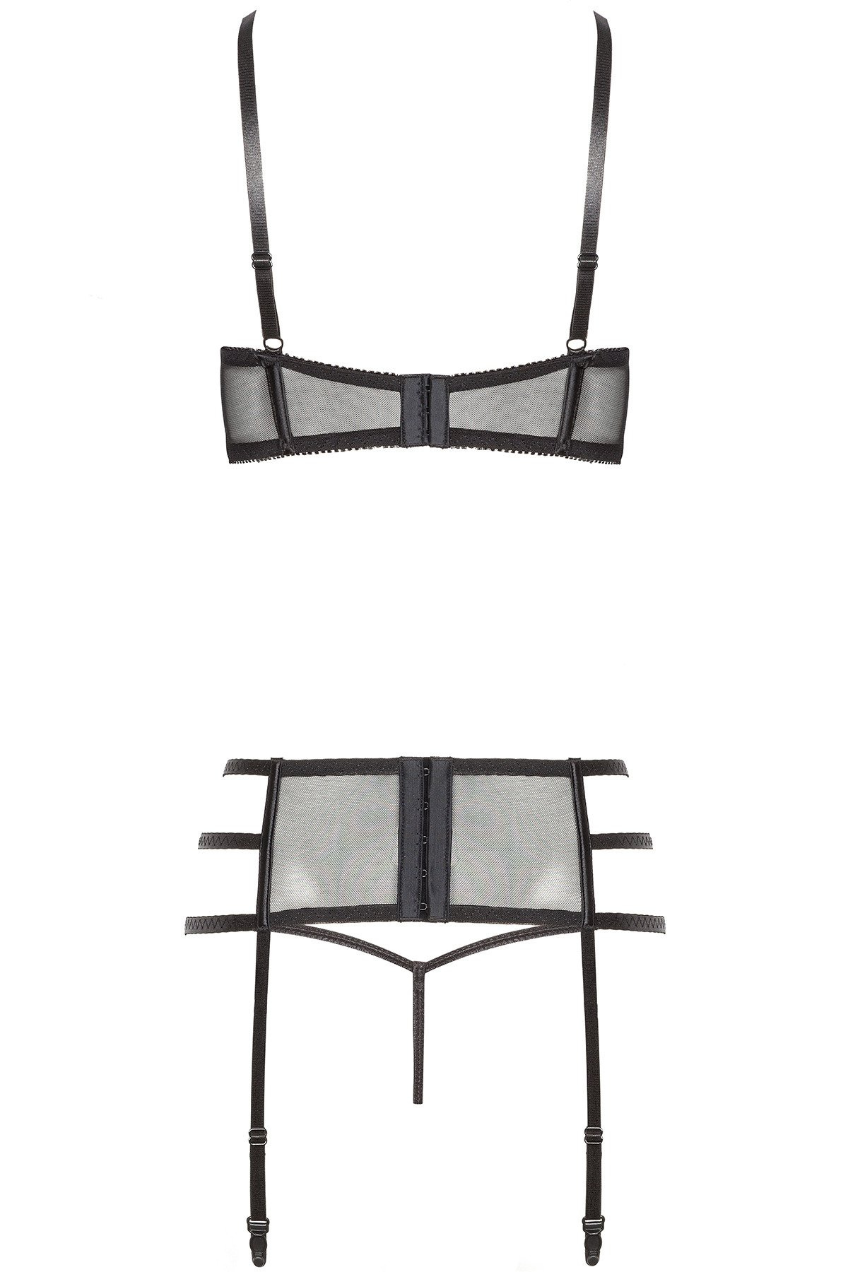 Schwarzes Straps-Set aus glitzernder Spitze. Mit gepolsterten Cups und verstellbaren BH-Trägern. Hinten am BH und am Gürtel mit einem mehrstufigen Häkchenverschluss. Am BH und am Strapsgürtel wurden vorne und hinten kurze Stäbchen eingearbeitet. Die vier Strapsen sind verstellbar. Die seitlich vernähten Gummibänder sorgen für eine hautenge Passform. Im Set ein passender String im gleichen Look, ohne Strümpfe. Alle Teile sind mit Schmuckstücken verziert.