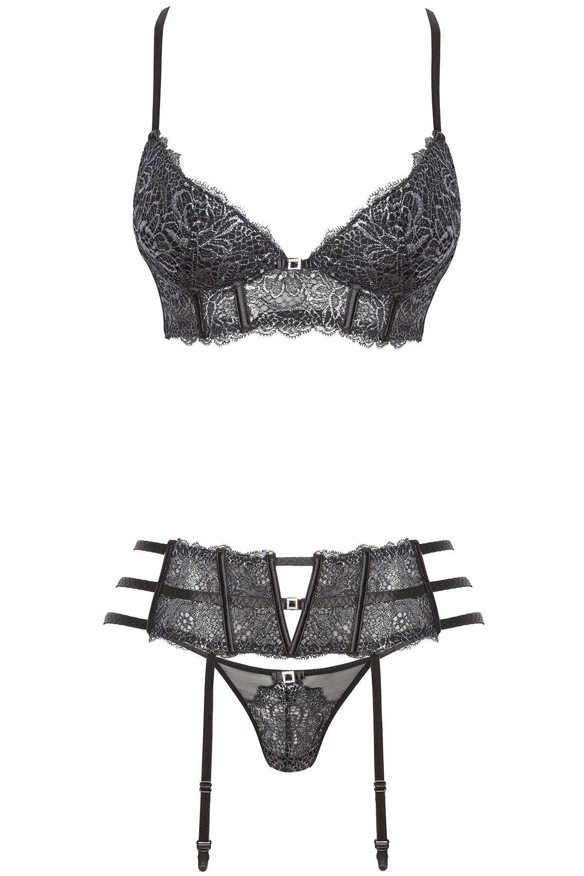 Schwarzes Straps-Set aus glitzernder Spitze. Mit gepolsterten Cups und verstellbaren BH-Trägern.... mehr