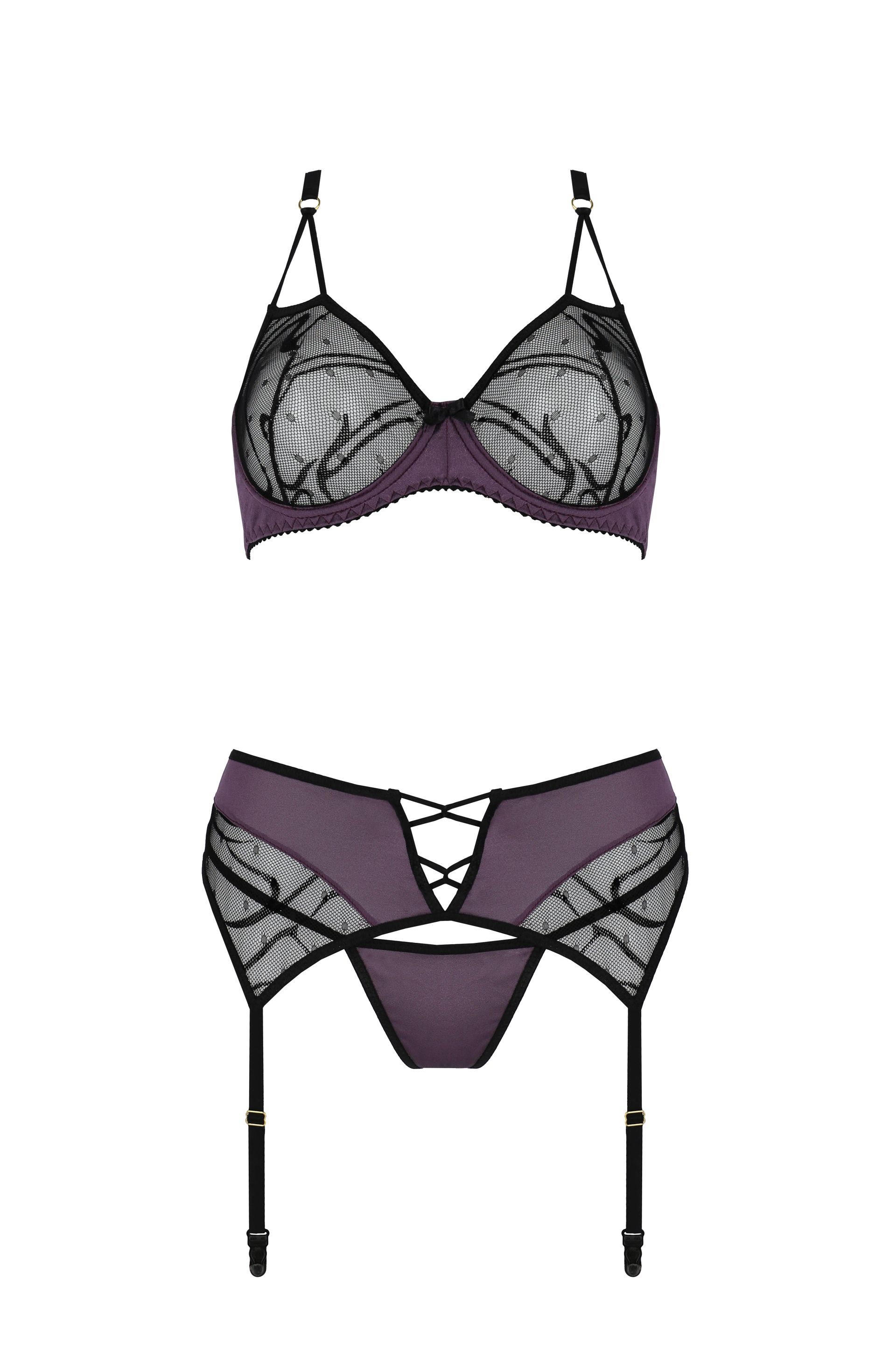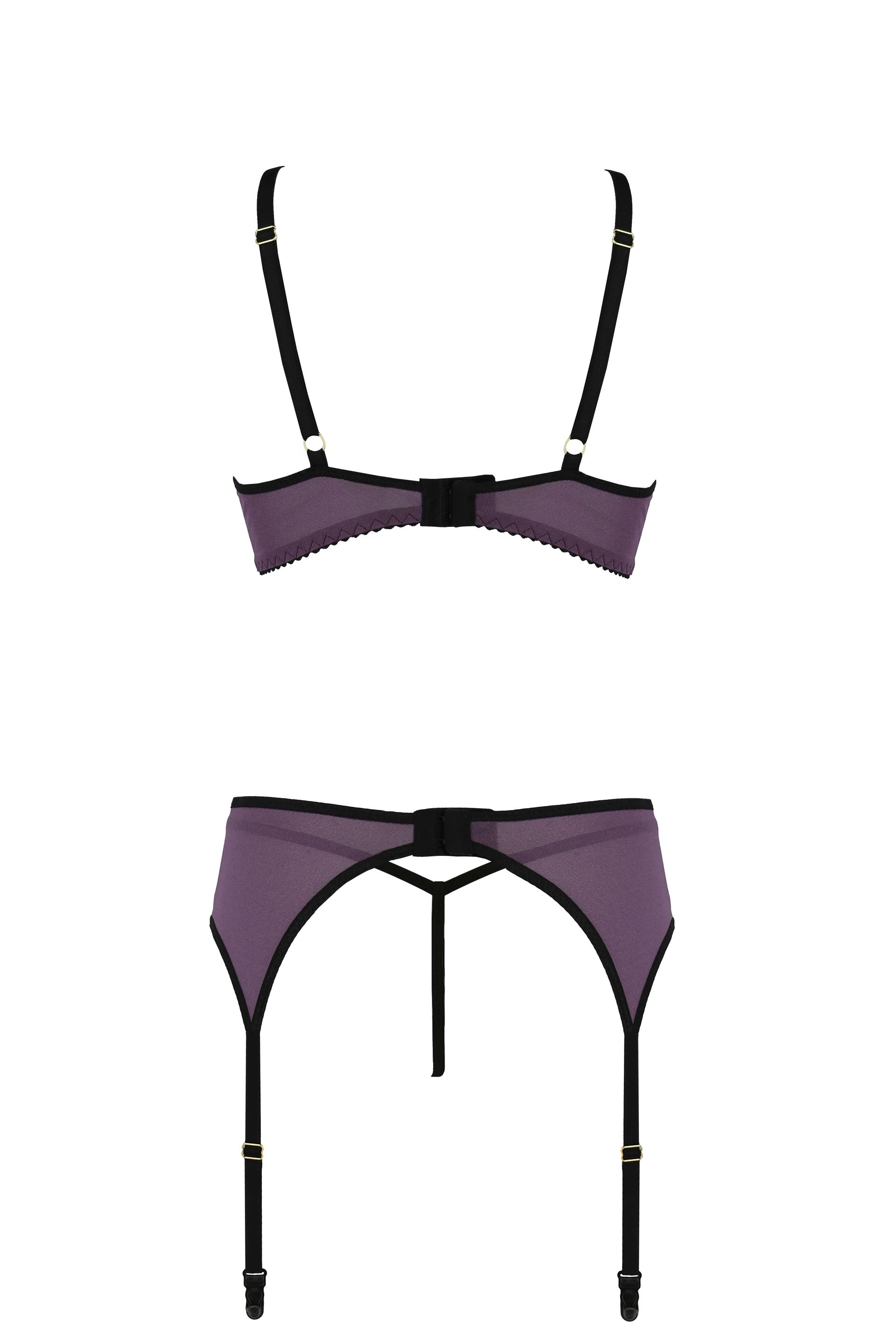 Transparentes Set aus schwarzem Tüll und violett-glänzendem Stoff. Der Bügel-BH und der Strumpfgürtel sind mehrstufig an die individuelle Passform einstellbar. Im Set mit String, ohne Strümpfe.