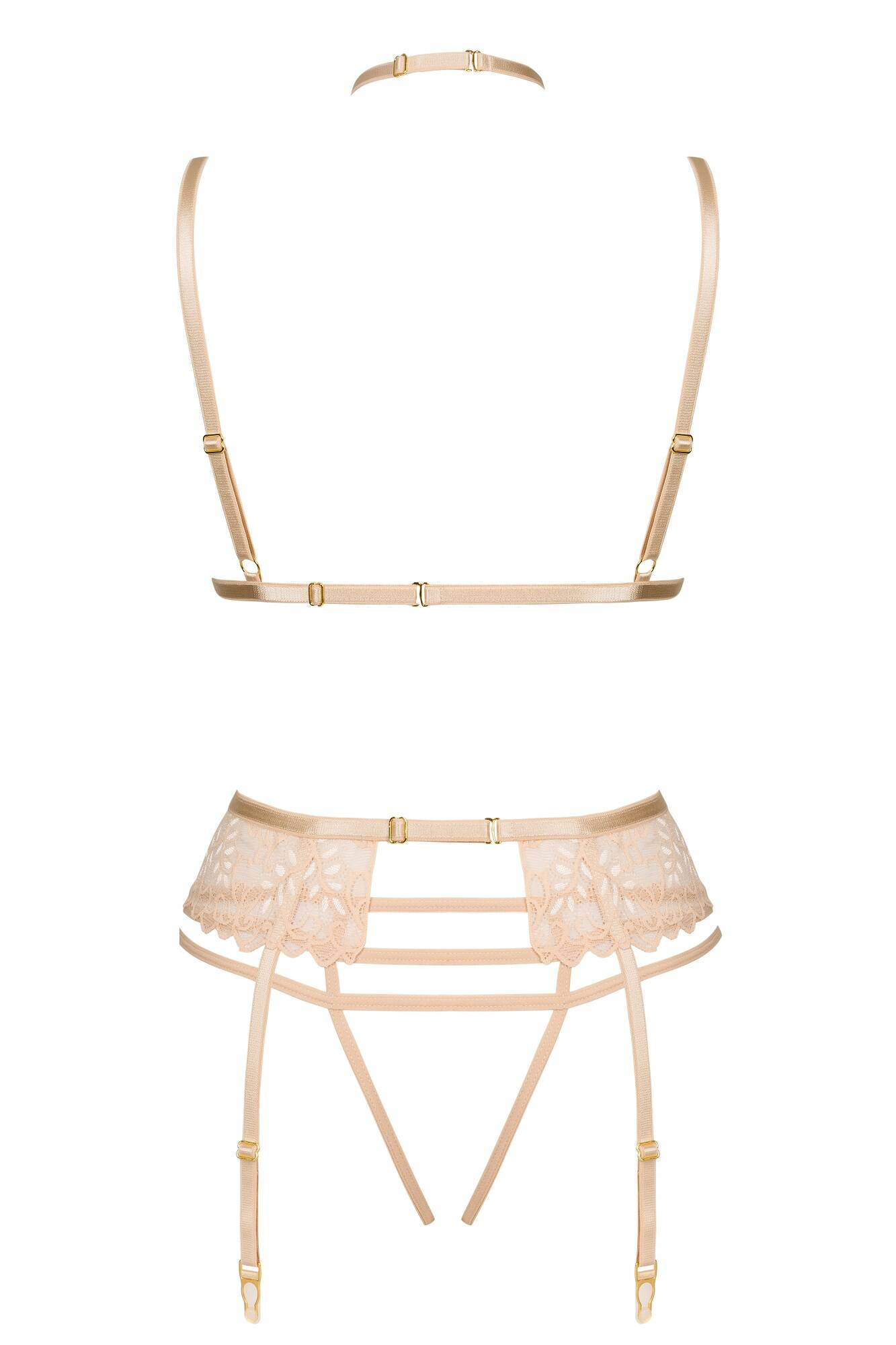 Beigefarbenes Dessous-Set aus Spitze. Der BH und der Strumpfgürtel sind individuell einstellbar. Im Set ein passender Ouvert-String.