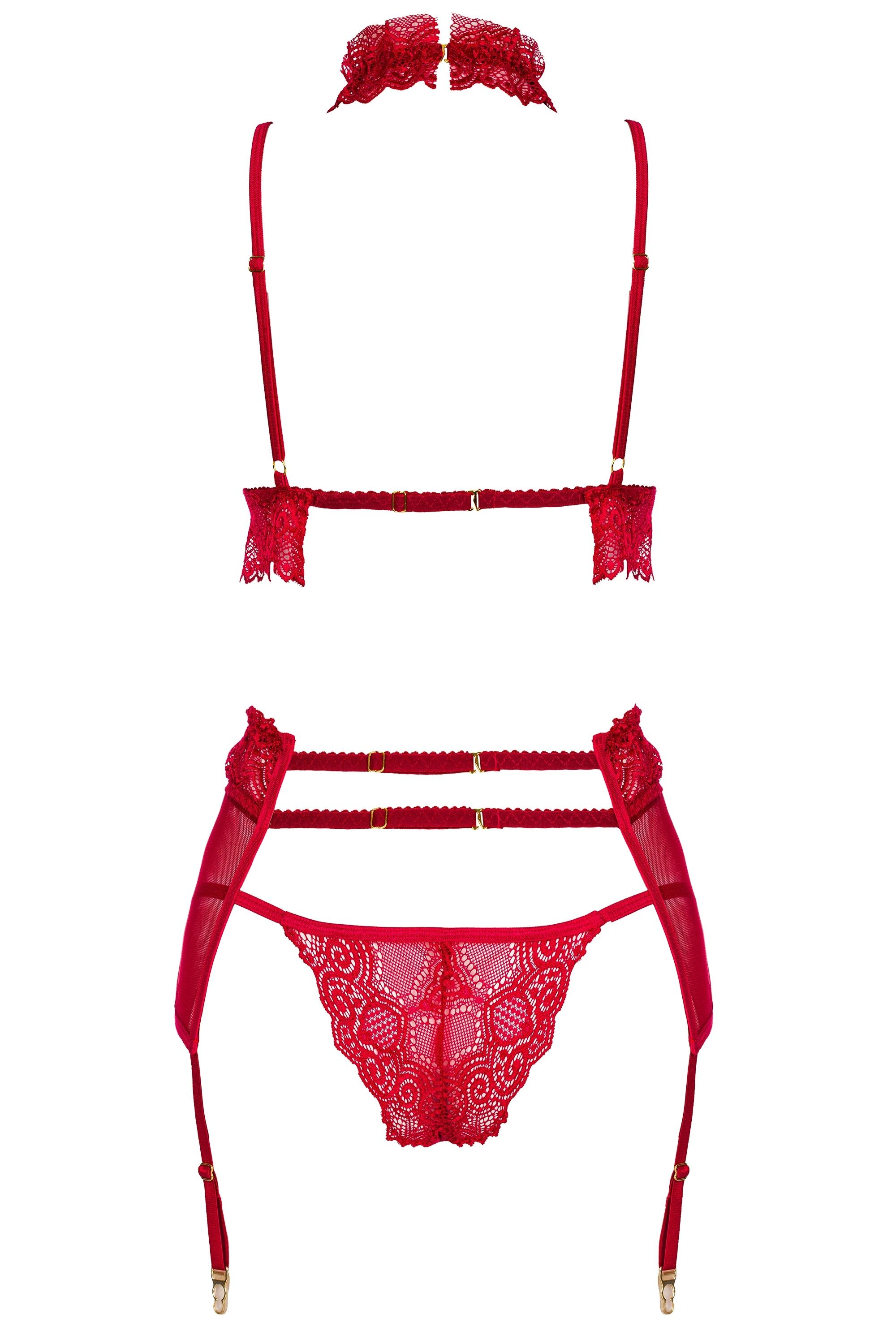 Straps-Set aus roter Spitze und transparentem Tüll. Das Halsband ist am BH fest angenäht. Inklusive Strumpfgürtel und String, ohne Strümpfe. Alle Teile sind individuell verstellbar.