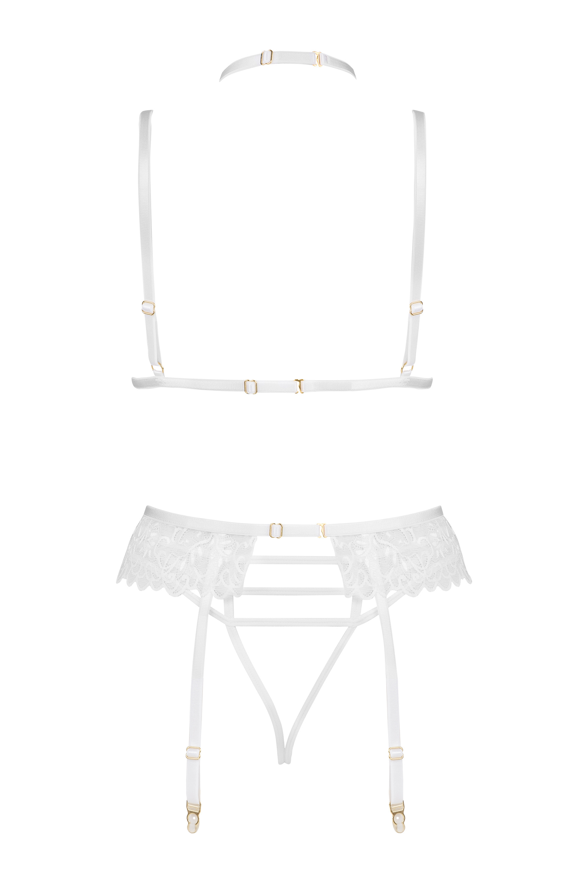 Straps-Set aus weißer Spitze. Der BH und der Strumpfgürtel sind mehrfach verstellbar. Inklusive einem passenden Ouvert-String, ohne Strümpfe.