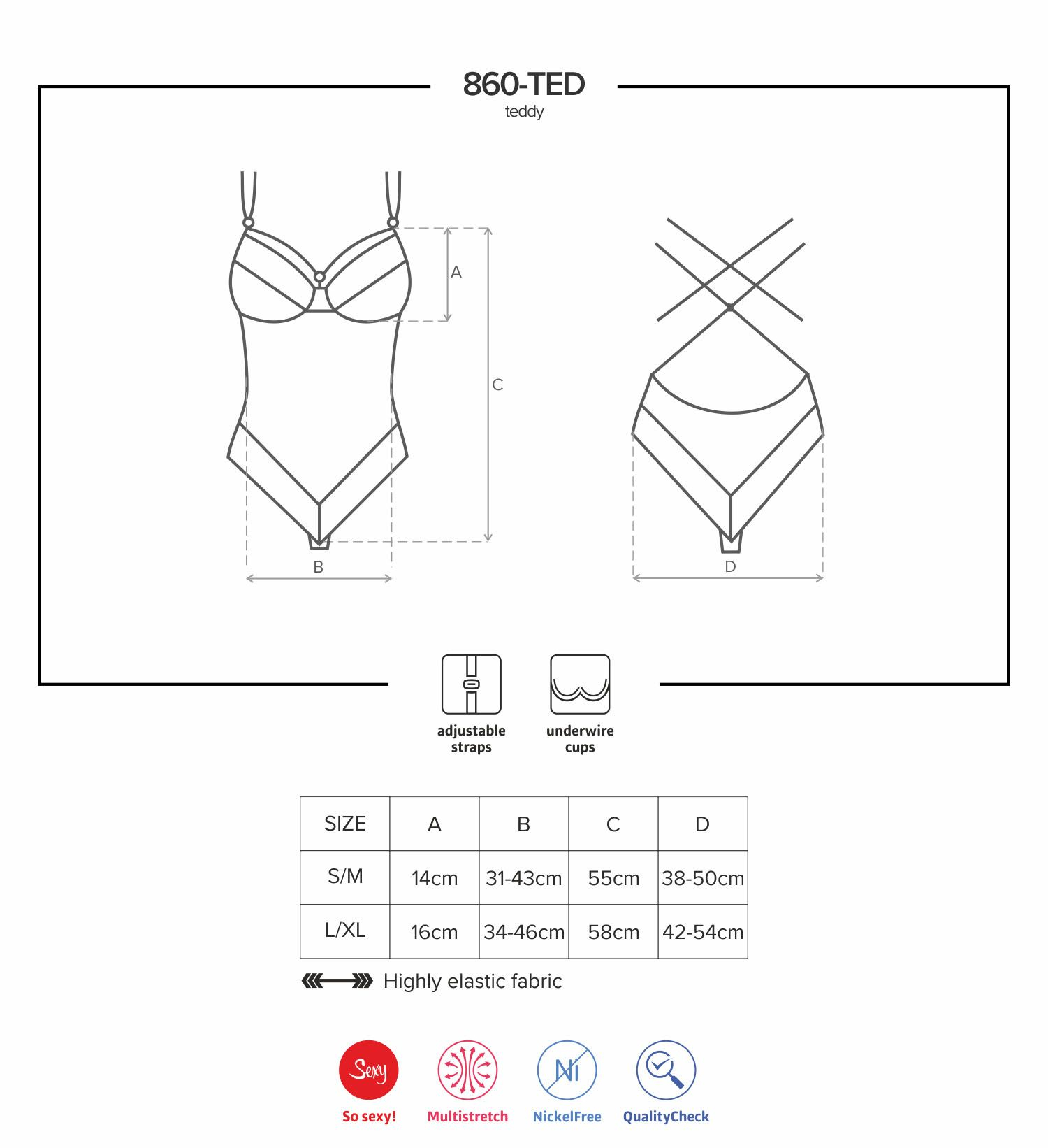 Schwarzer Body aus Spitze mit Blumenmuster. Die Träger sind längenverstellbar. Rückenfrei und hinten mit gekreuzten Riemchen. Zwischen den Cups mit einem Schmuckelement. Aus transparentem und elastischem Material.