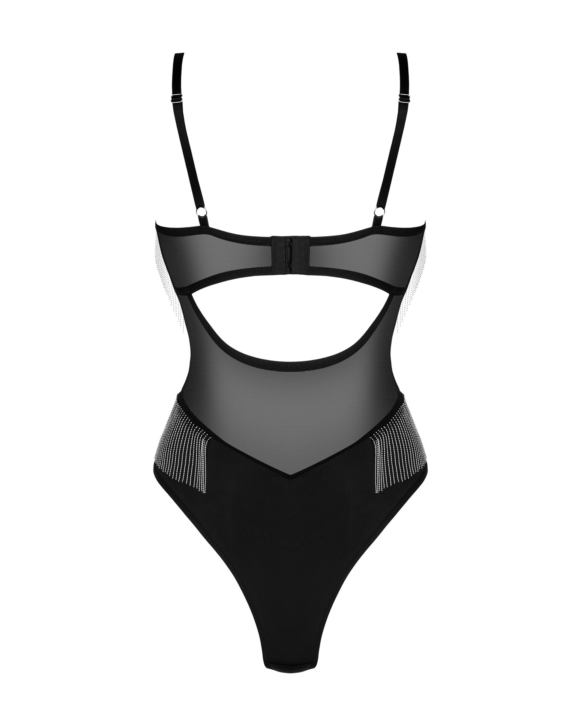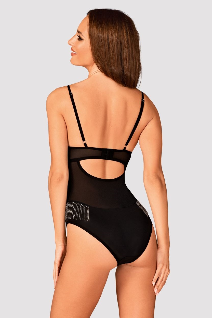 Schwarzer Body teiltransparentem Stretch-Material. Mit leicht gepolsterten Bügel-Cups und verstellbarem Rückenverschluss. Unter der Brust und an den Hüften mit Metallkettchen verziert.
