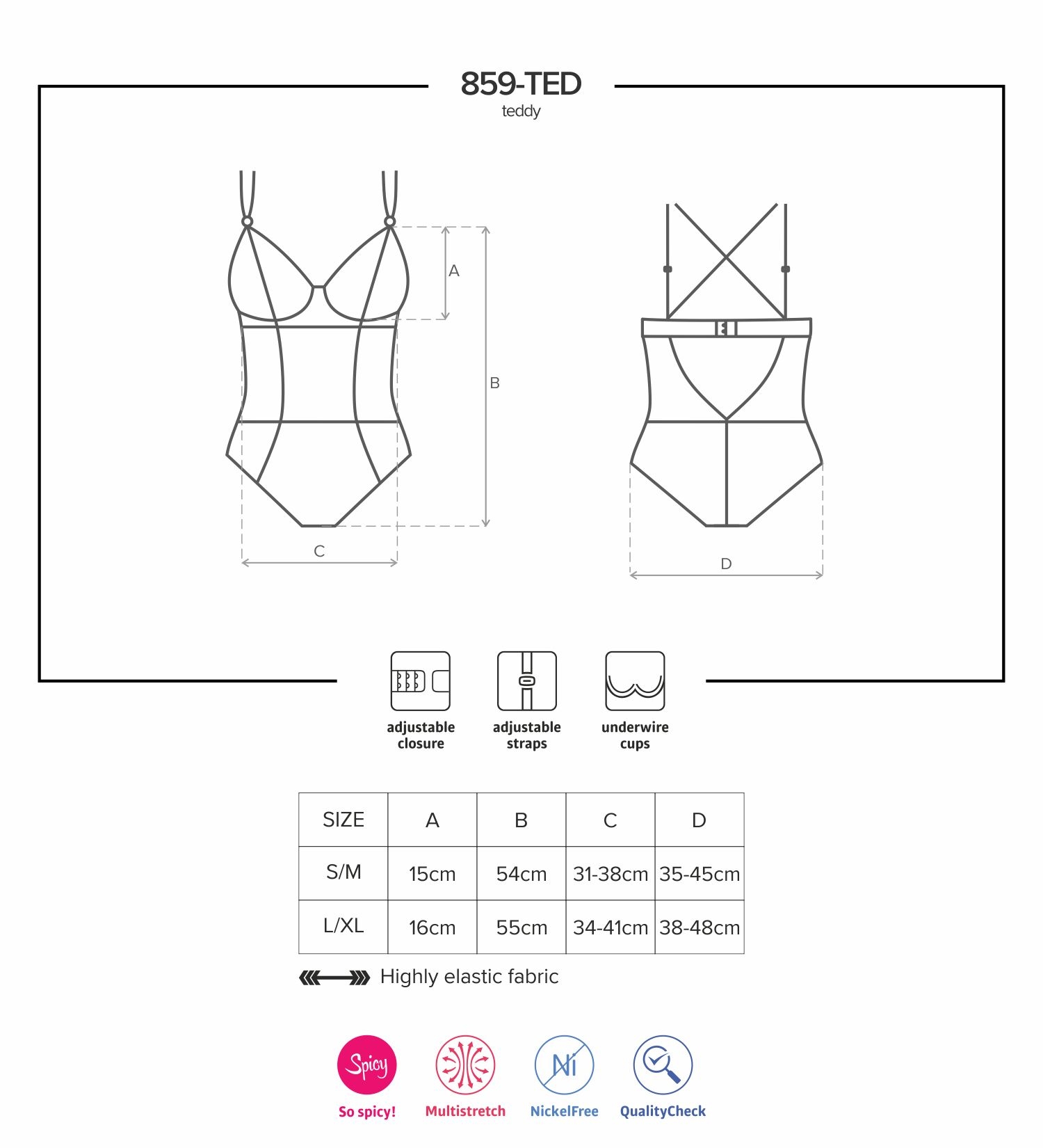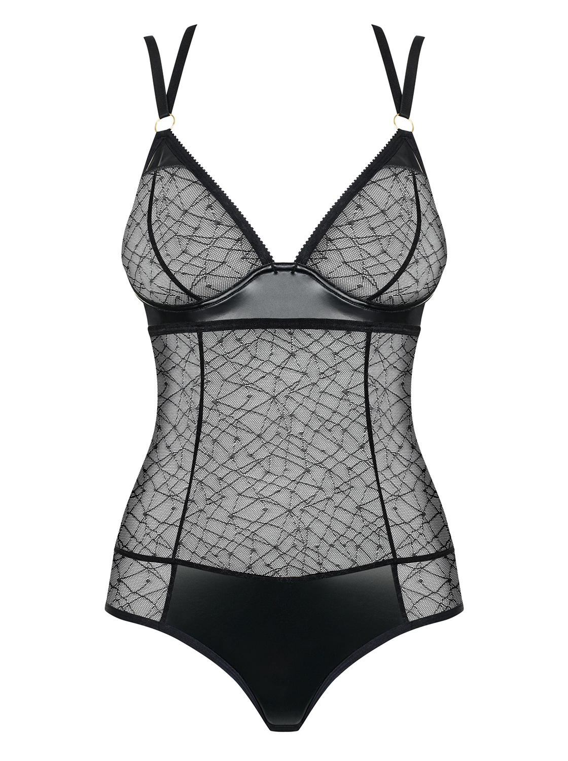 Body in schwarz aus transparentem Tüll mit dezentem Muster und Einsätzen im Latex-Look. Mit verstellbaren Trägern und mehrstufigem Rückenverschluss. Zusätzliche Riemchen kreuzen sich am Rücken. Die transparenten Bügel-Cups lassen den Busen voller aussehen. Mit einem verstellbaren Verschluss im Schritt. Aus weichem und elastischem Material genäht.