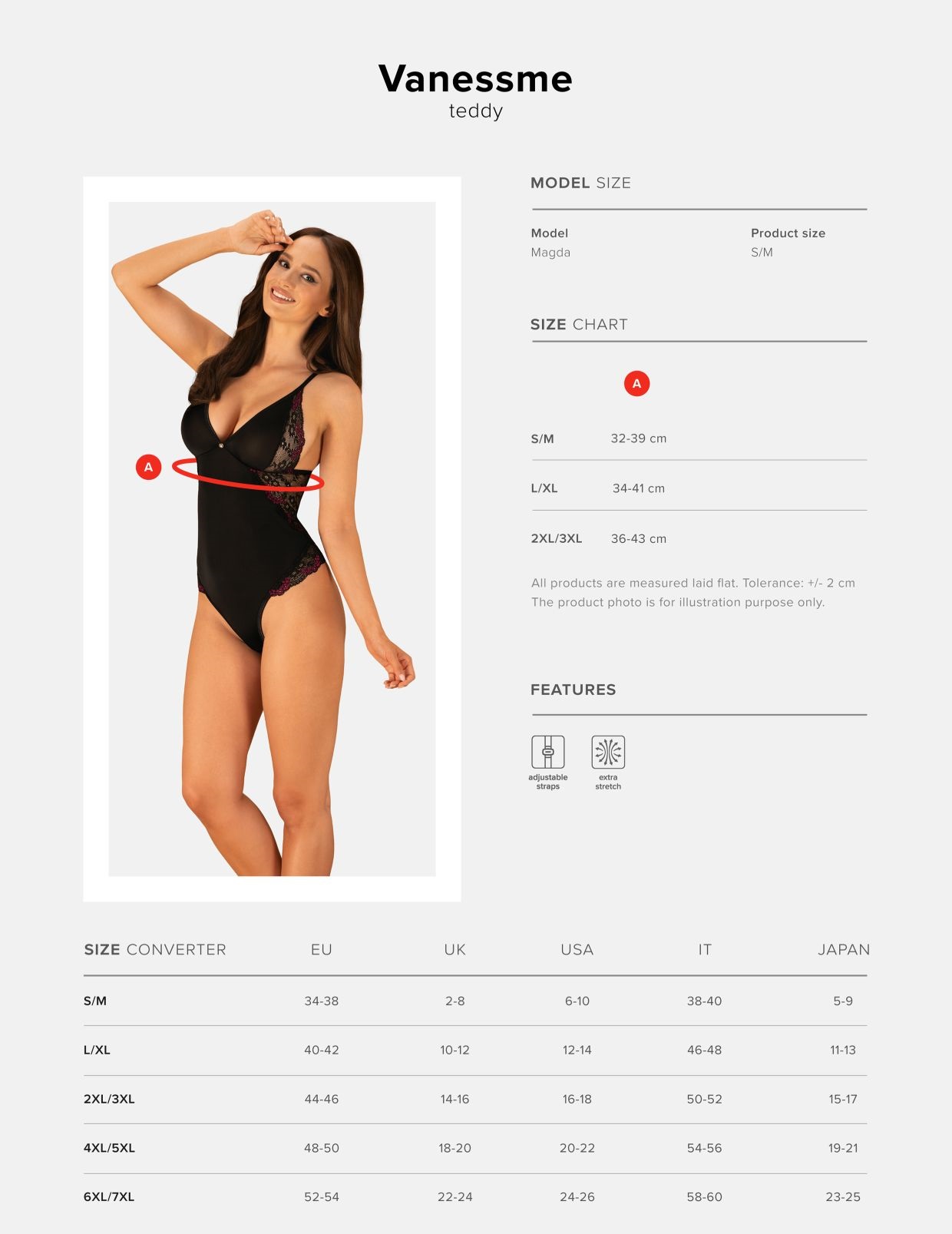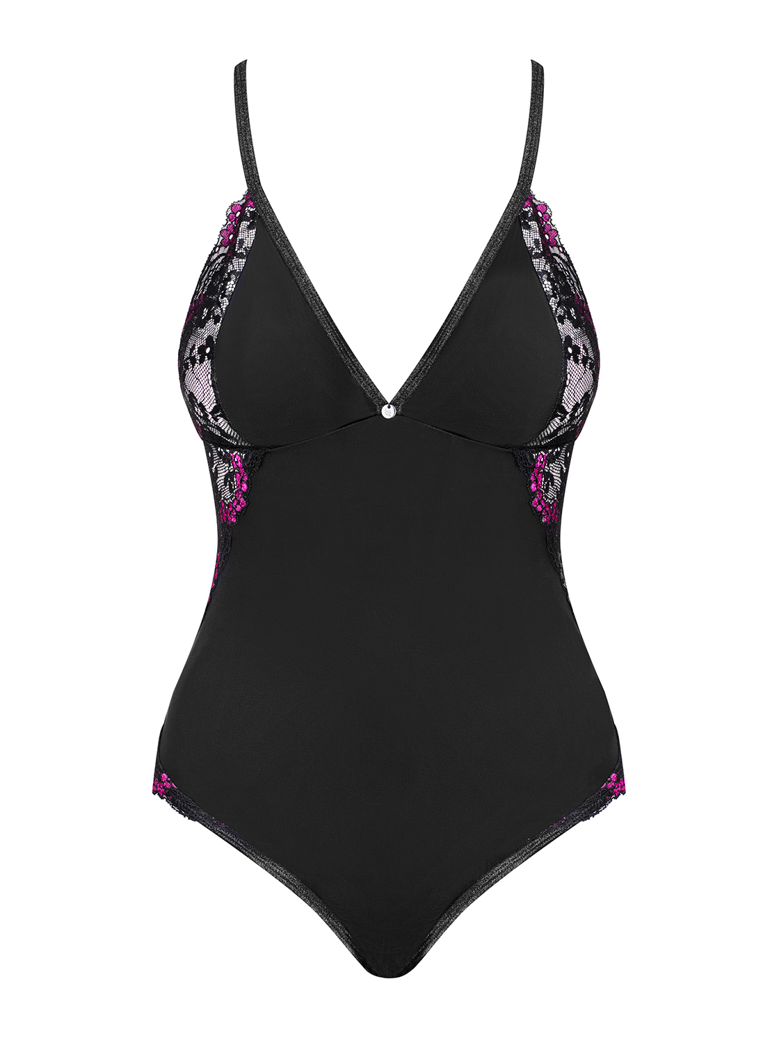 Schwarzer Body aus elastischem Stoff. Vorne blickdicht und hinten aus transparentem Netz mit Blumenmotiv. Mit roten Blumen-Stickereien verziert.