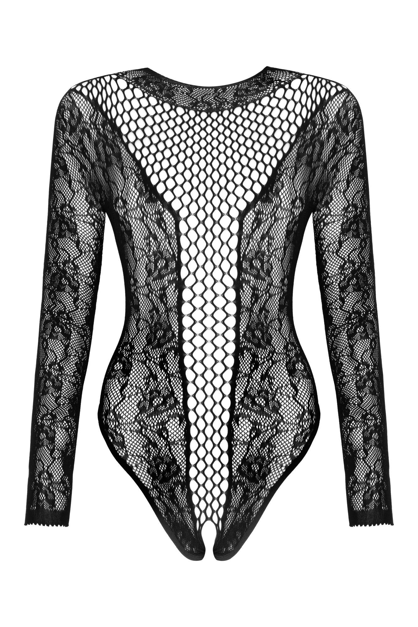 Schwarzer, langärmliger Netzbody aus elastischem Material. Am Schritt offen (ouvert). mehr